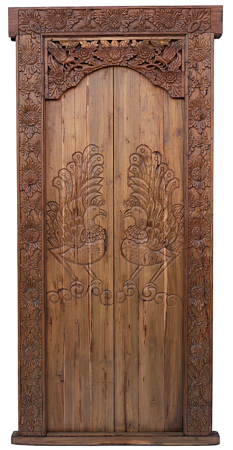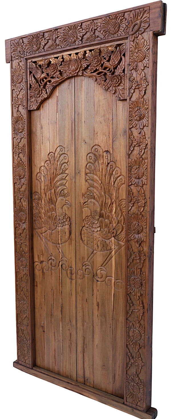 Zachwycające i piękne drzwi wykonane i odrestaurowane ręcznie w Indonezji z litego drewna tekowego. Rzeżbione w kolorze jasno-brązowym. Wymiary przejścia to: 190x80cm. Drzwi dwuskrzydłowe.