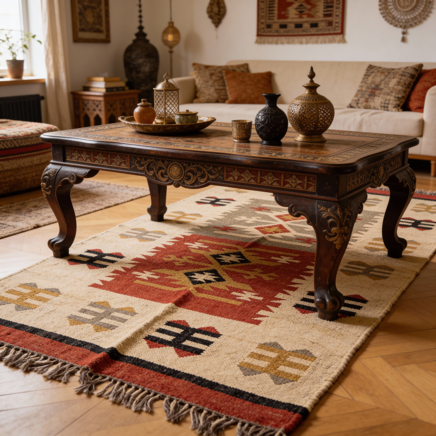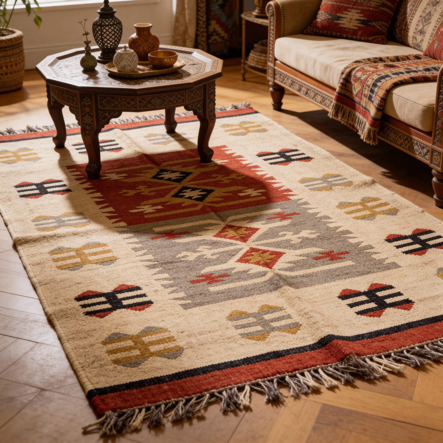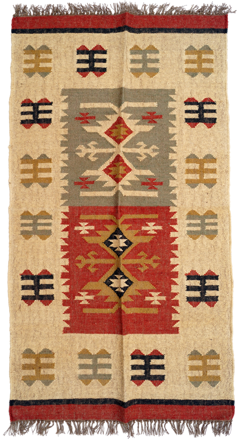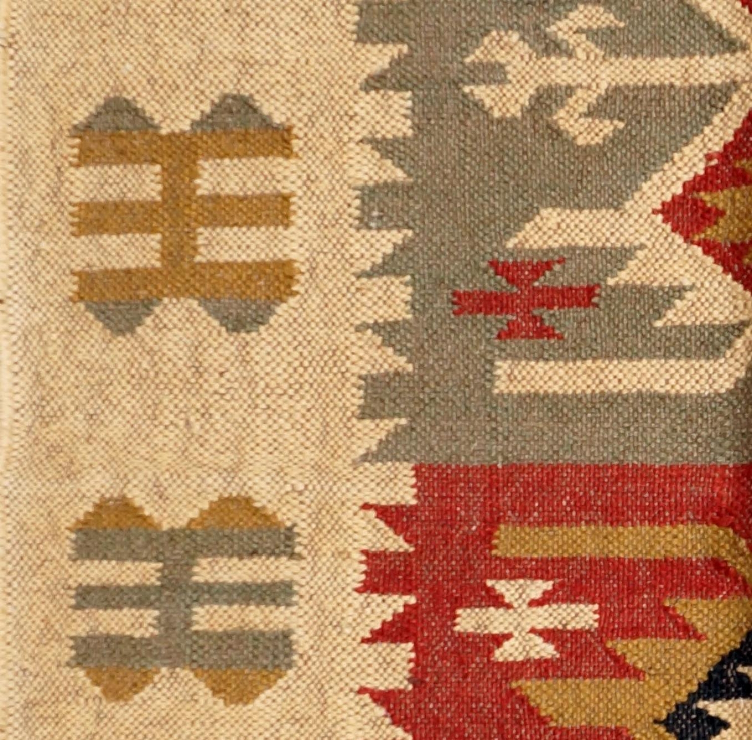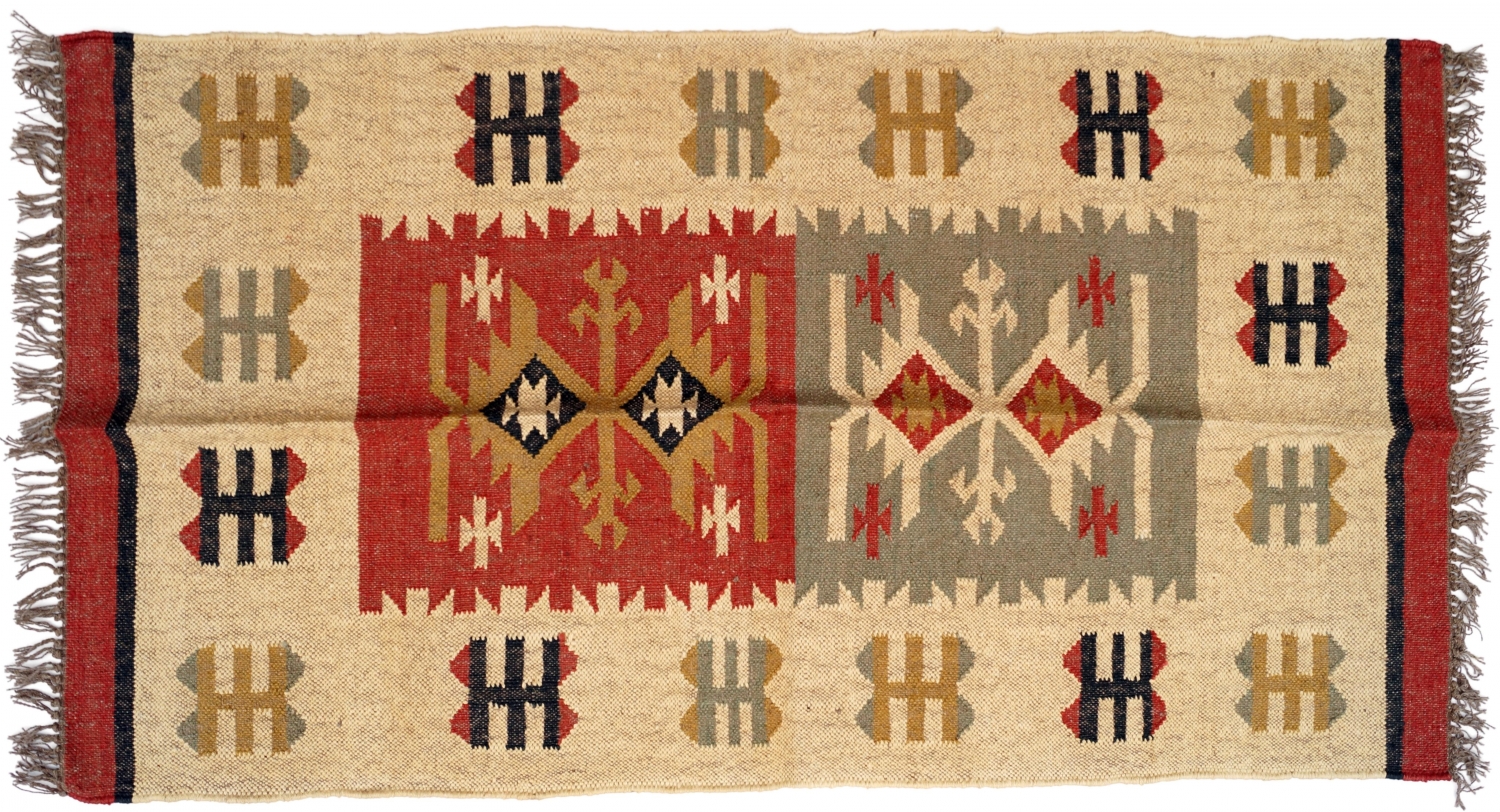 Ręcznie tkany dywan/kilim indyjski z wełny i juty. Kolor czerwono-beżowy z odcieniami  szarości.