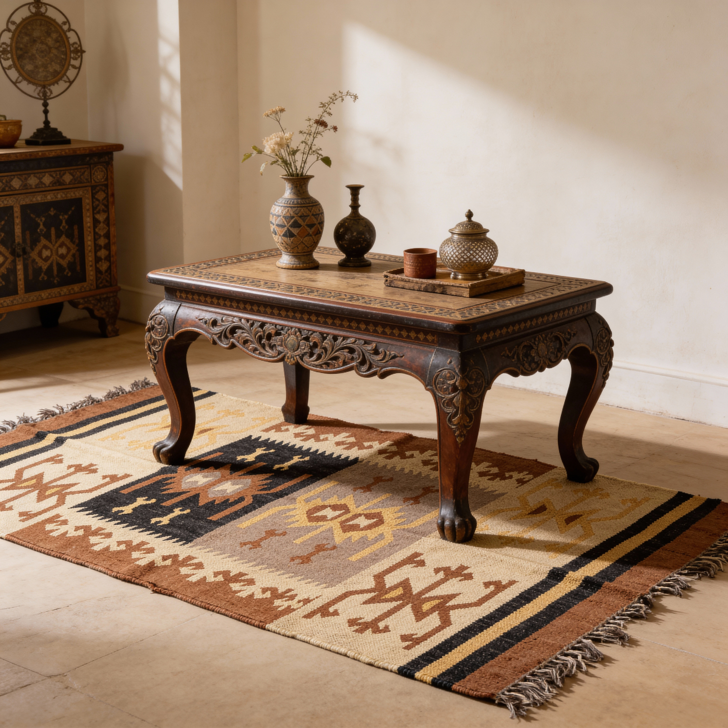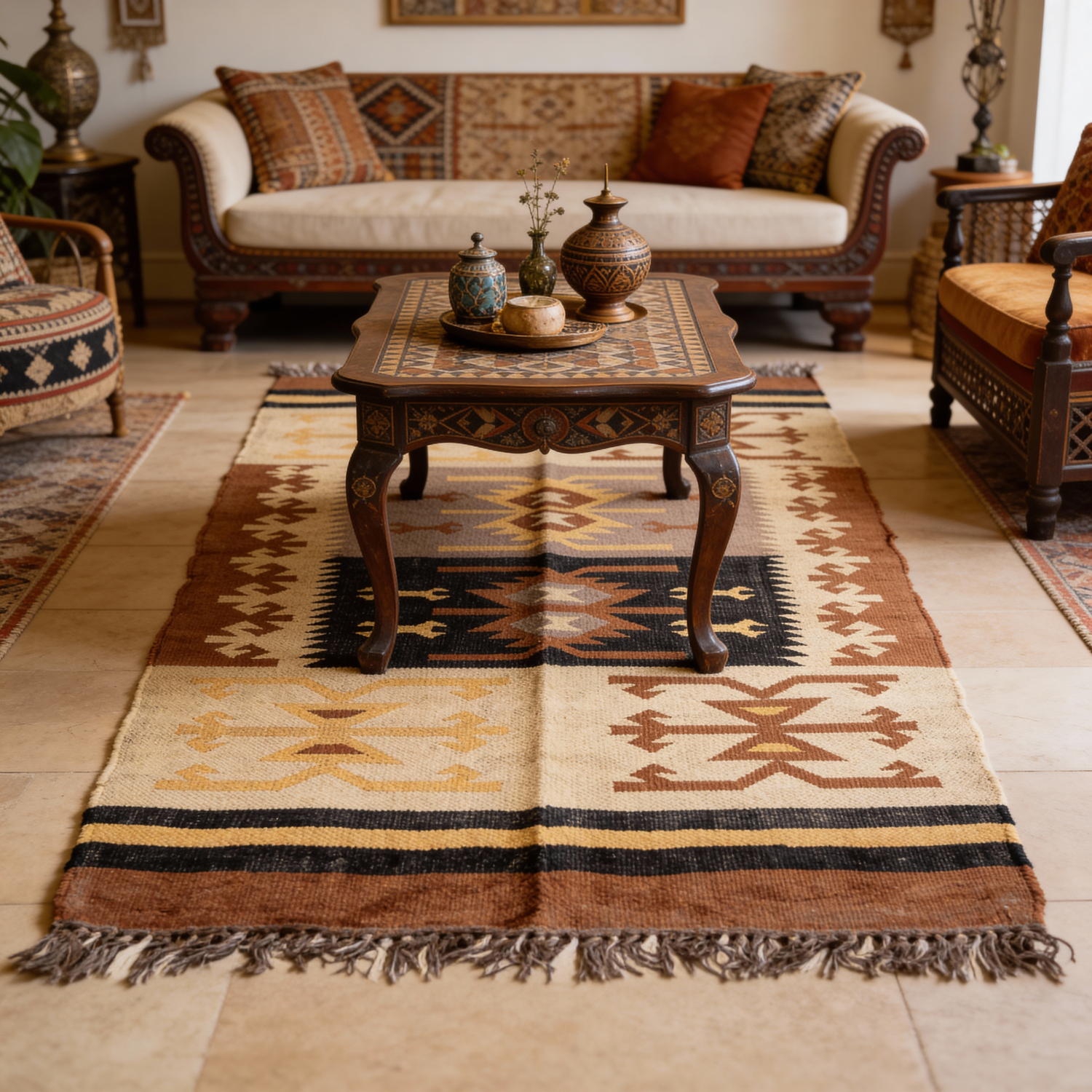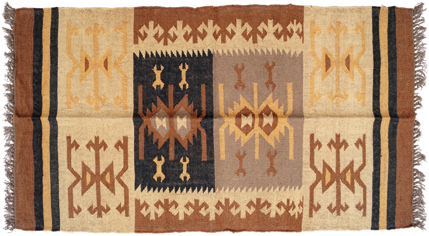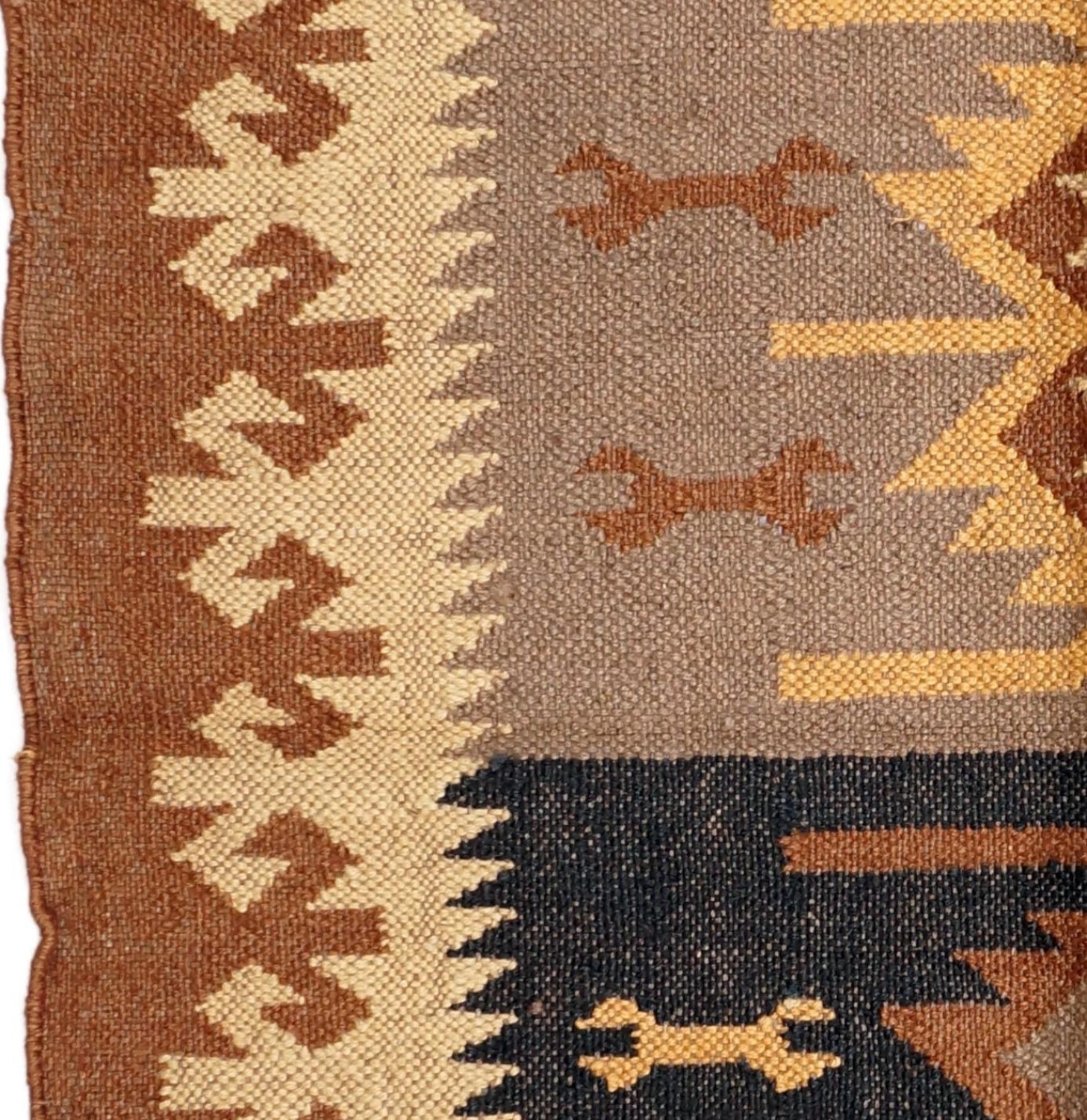 Ręcznie tkany dywan/kilim indyjski z wełny i juty. Kolor brązowo-beżowy z odcieniami czerni i szarości.
