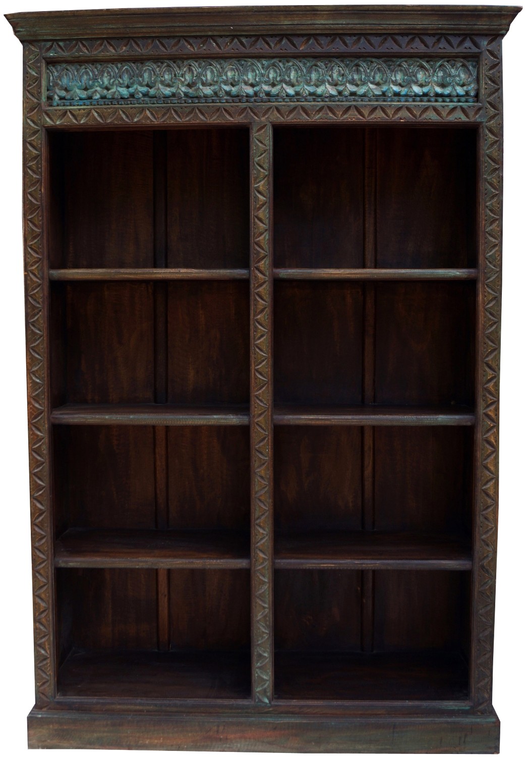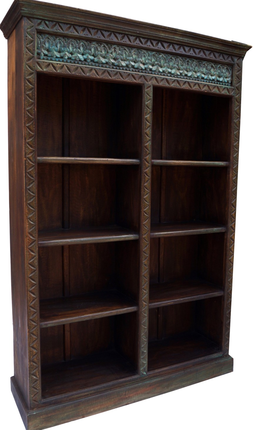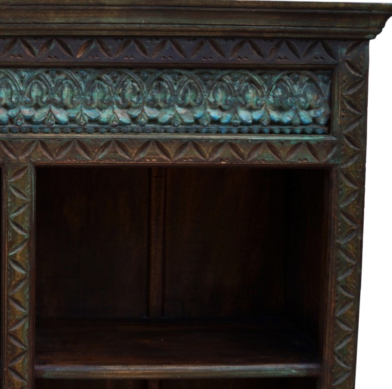Wyjątkowo piękny i duży indyjski rzezbiony regał antyczny, wykonany w całości z drewna egzotycznego z odzysku. Do jego stworzenia wykorzystano elementy, które zdobiły niegdyś indyjskie rezydencje.