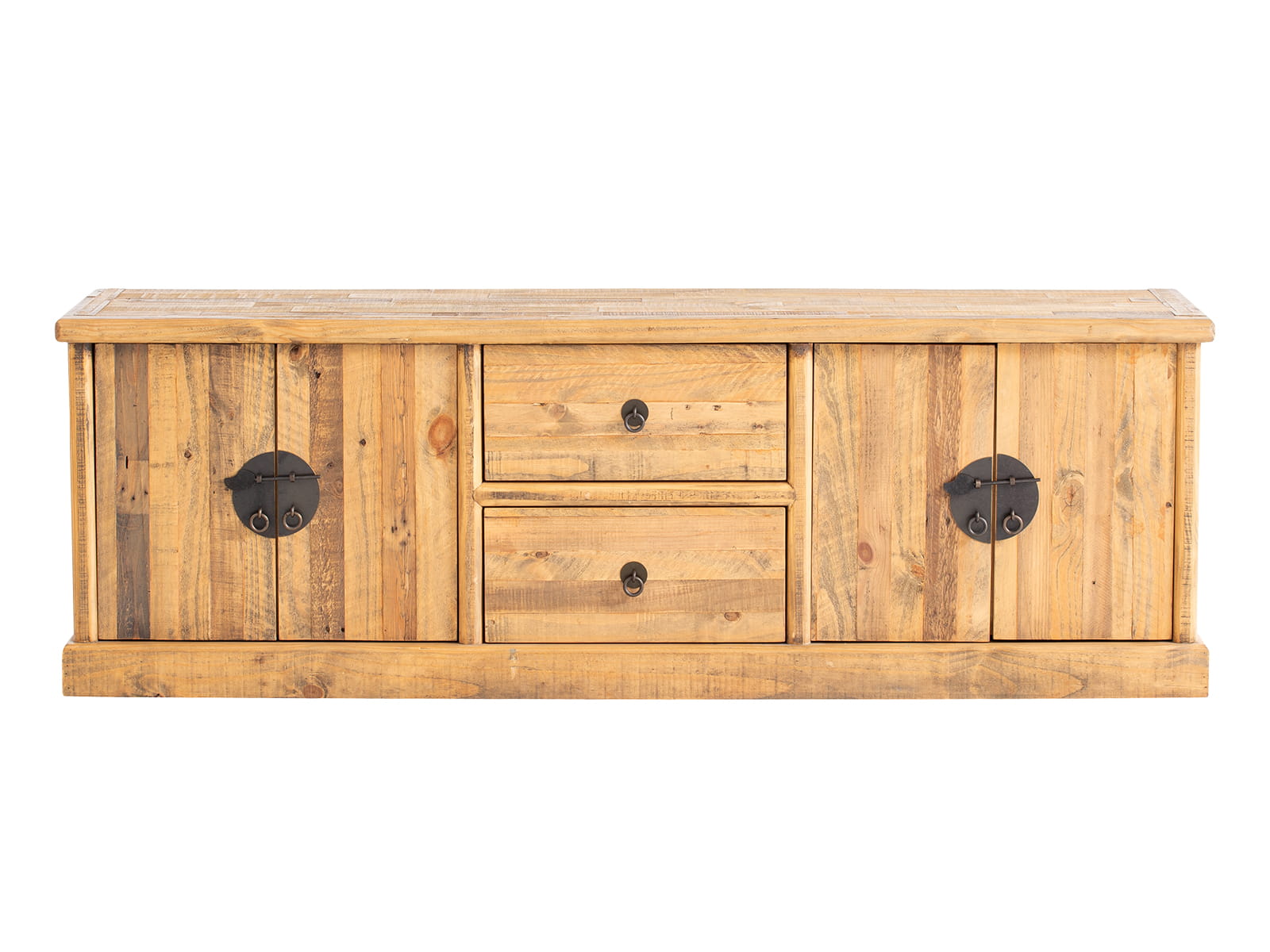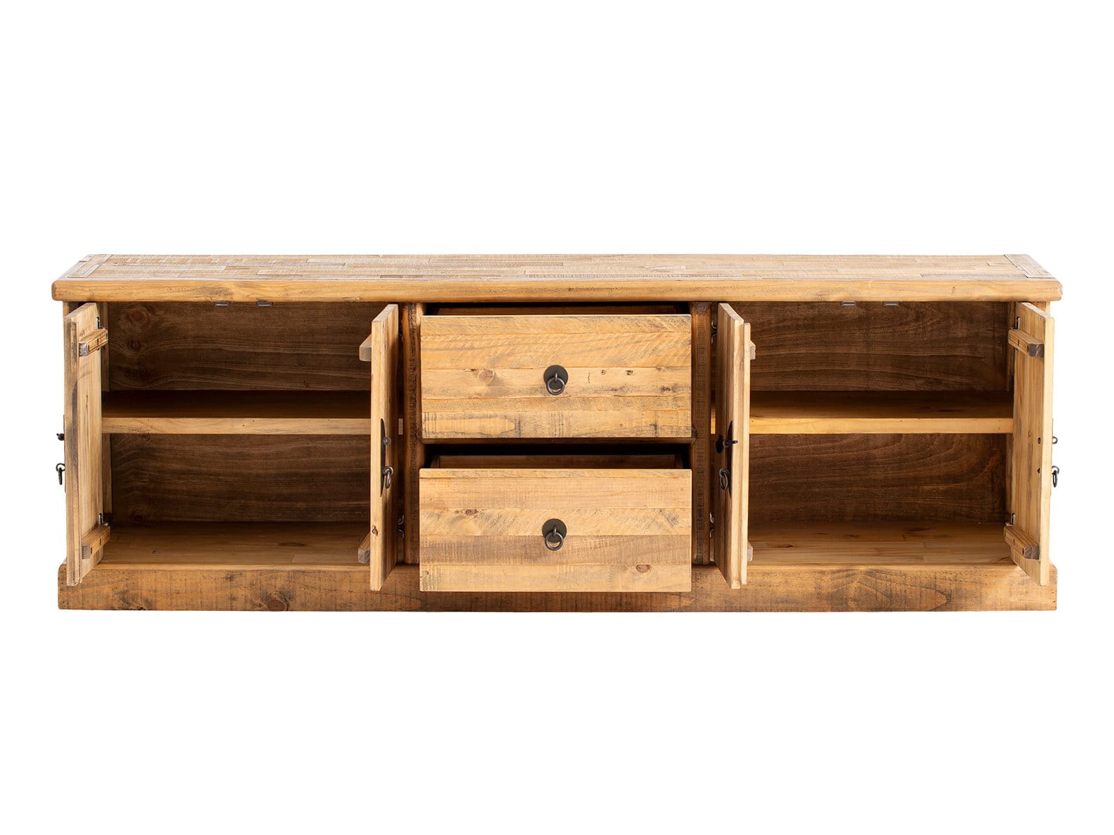 Komoda RTV z serii Laredo wykonana została w Indiach z litego drewna indyjskiej sosny. Komoda jest wyjątkowo pojemna, dzięki dużej szerokości aż 190cm i głębokości 50cm. Dwie duże szuflady oraz dwa przestronne przedziały za podwójnymi drzwiczkami oferują miejsce na wszelkiego rodzaju sprzęt multimedialny, a także gry, konsole i książki lub akcesoria domowe. Drzwiczki ozdobione są metalowymi okrągłymi okuciami w stylu orientalnym.