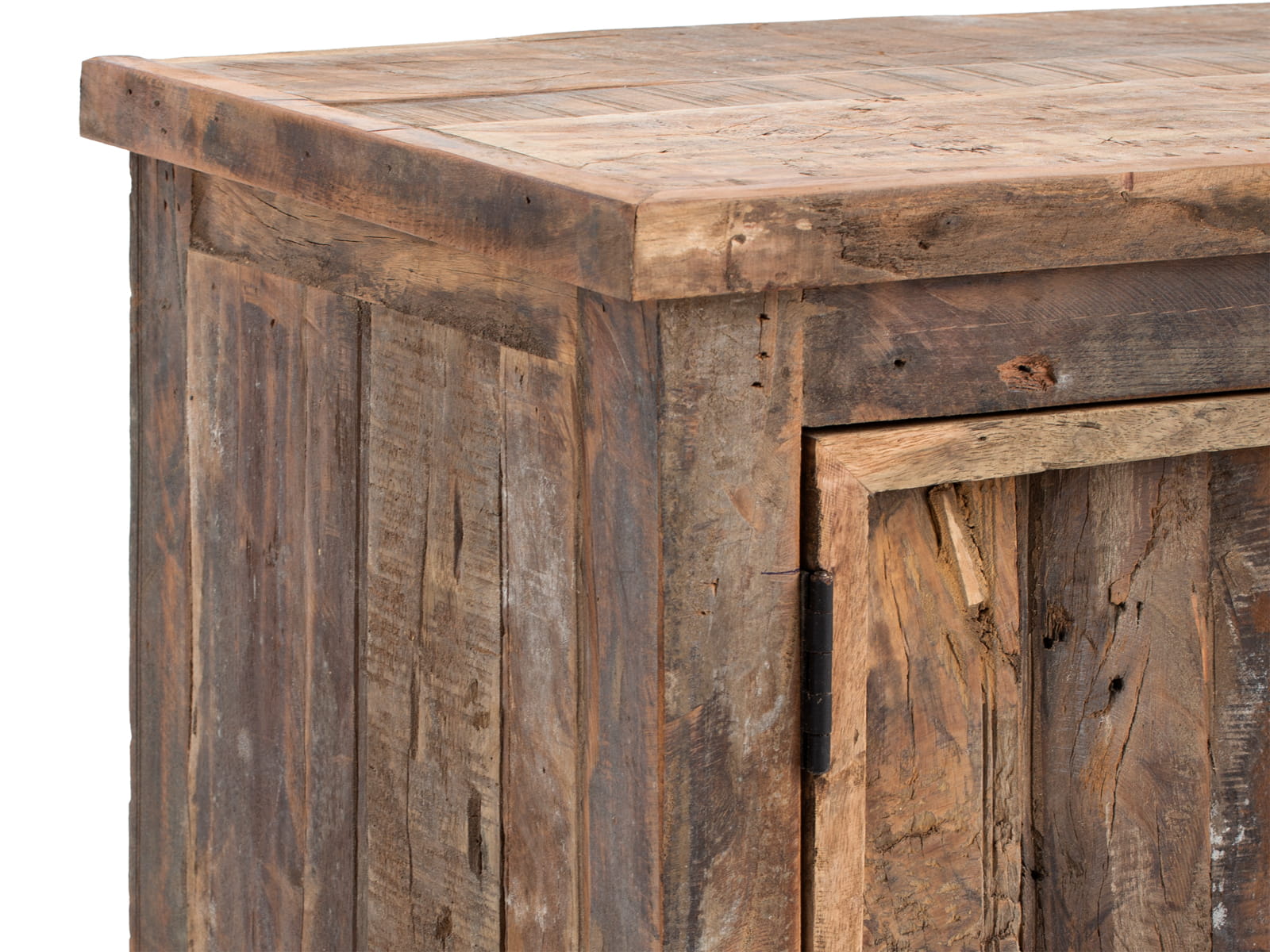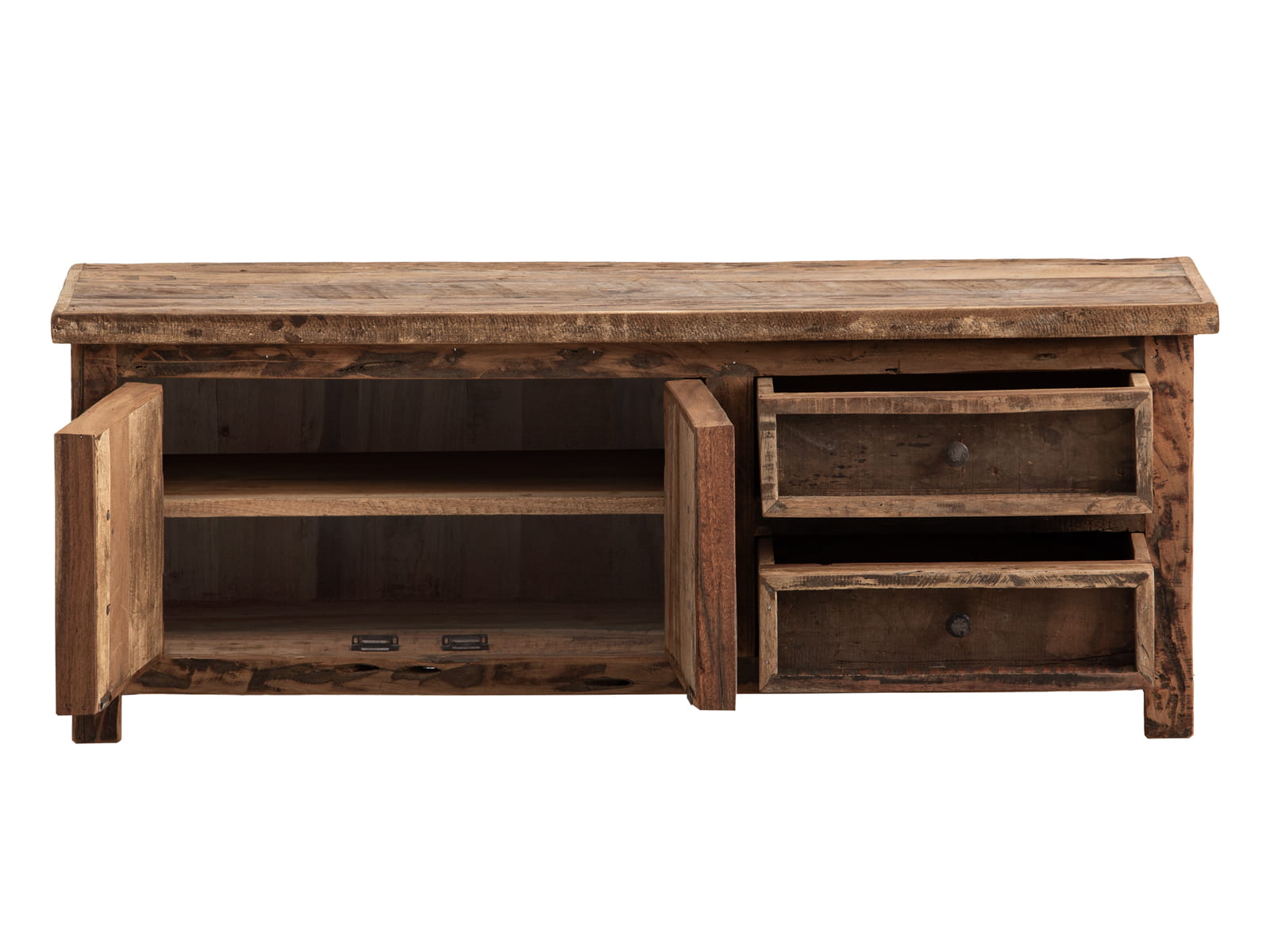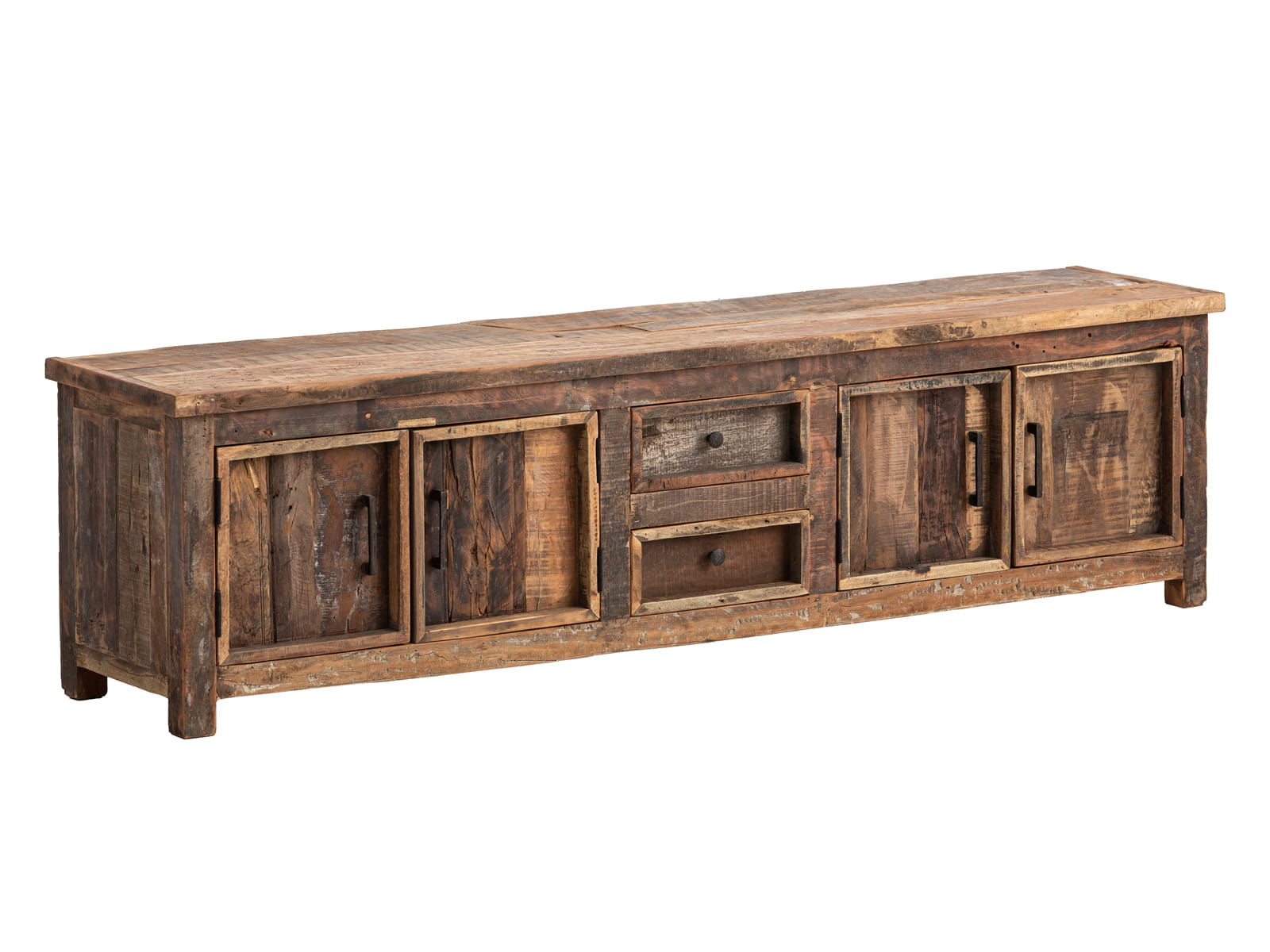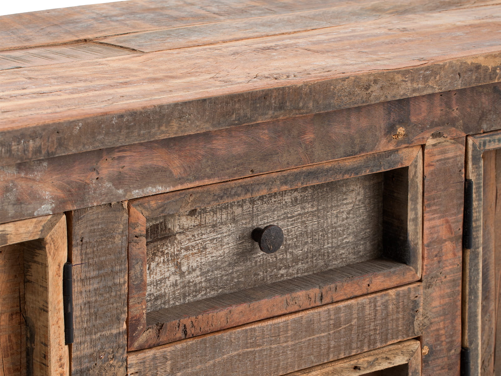 Duża komoda RTV z serii Sumatra, czterodrzwiowa, z dwiema szufladami. Jak wszystkie meble z tej serii, jest wykonana ręcznie w Indiach, ze starego drewna. Niepowtarzalny urok odzyskanego drewna, ponadczasowa uroda i styl tego mebla będą ozdobą każdego rustykalnego lub nowoczesnego wnętrza.