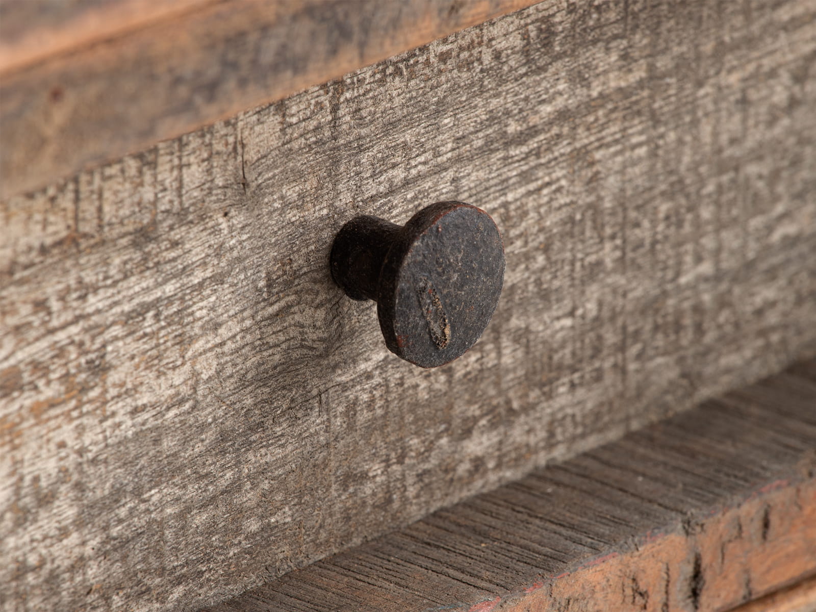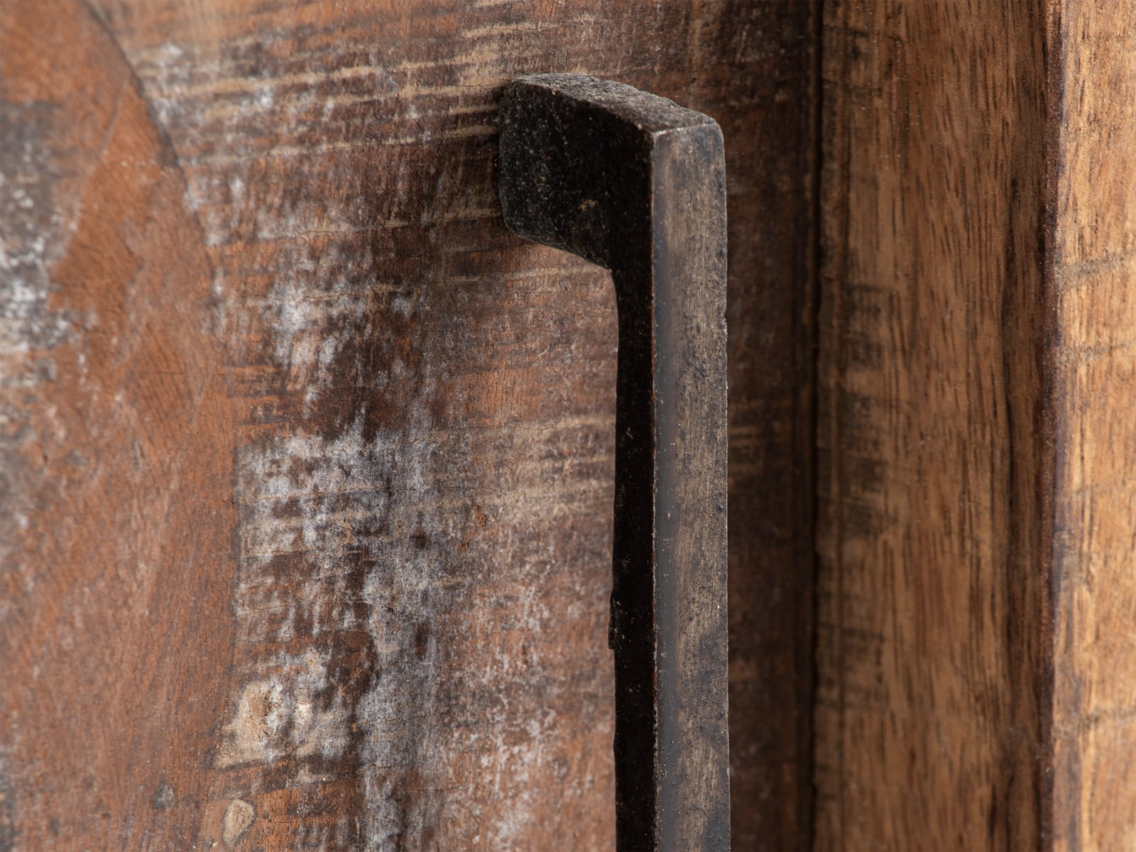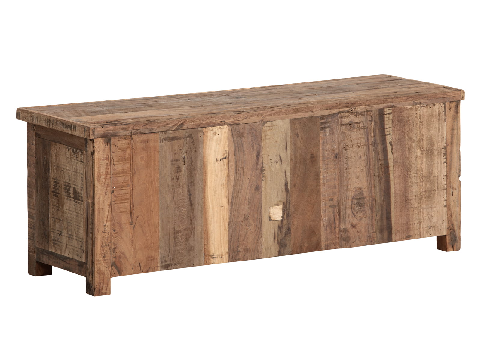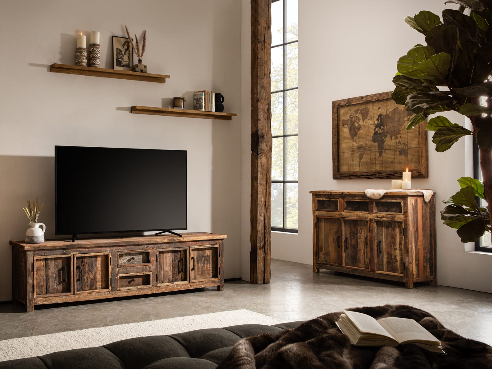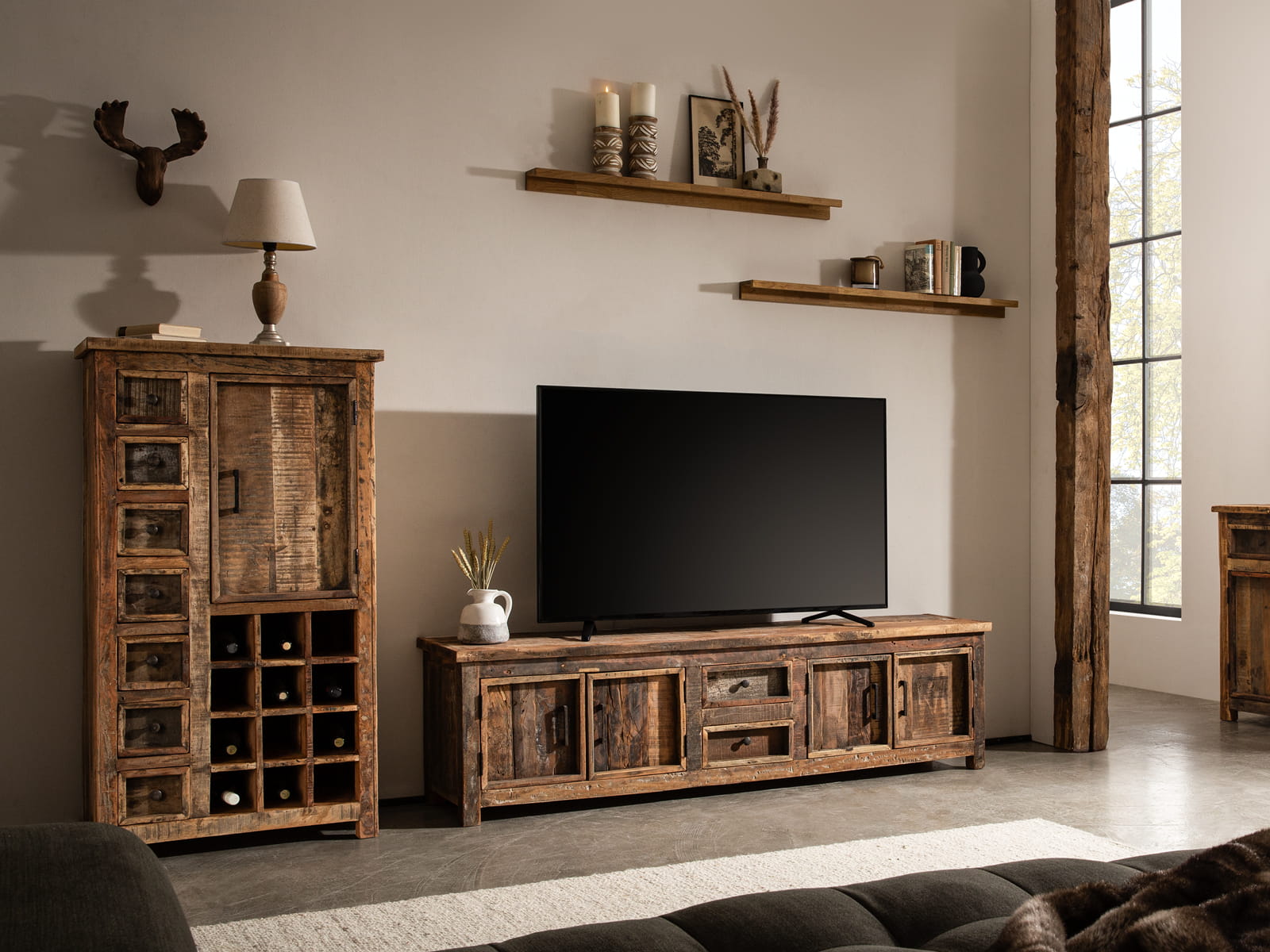 Duża komoda RTV z serii Sumatra, czterodrzwiowa, z dwiema szufladami. Jak wszystkie meble z tej serii, jest wykonana ręcznie w Indiach, ze starego drewna. Niepowtarzalny urok odzyskanego drewna, ponadczasowa uroda i styl tego mebla będą ozdobą każdego rustykalnego lub nowoczesnego wnętrza.
