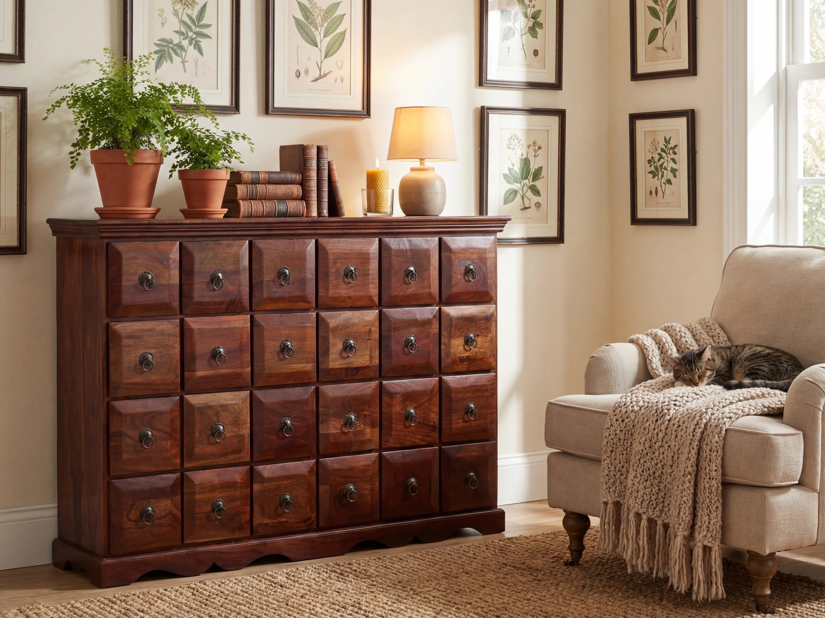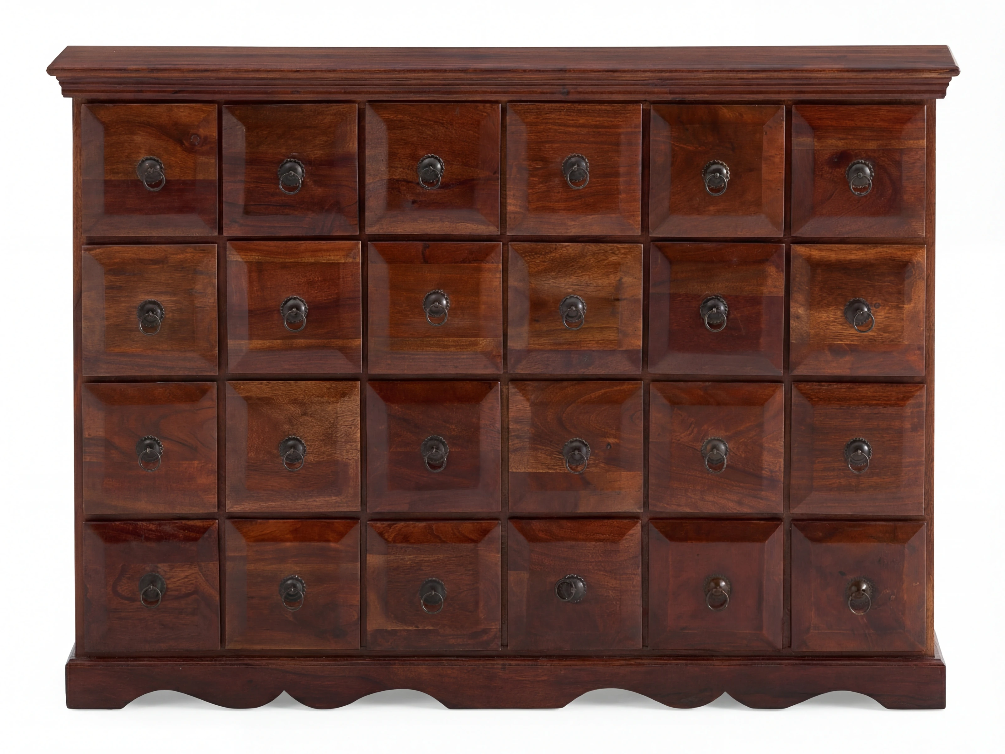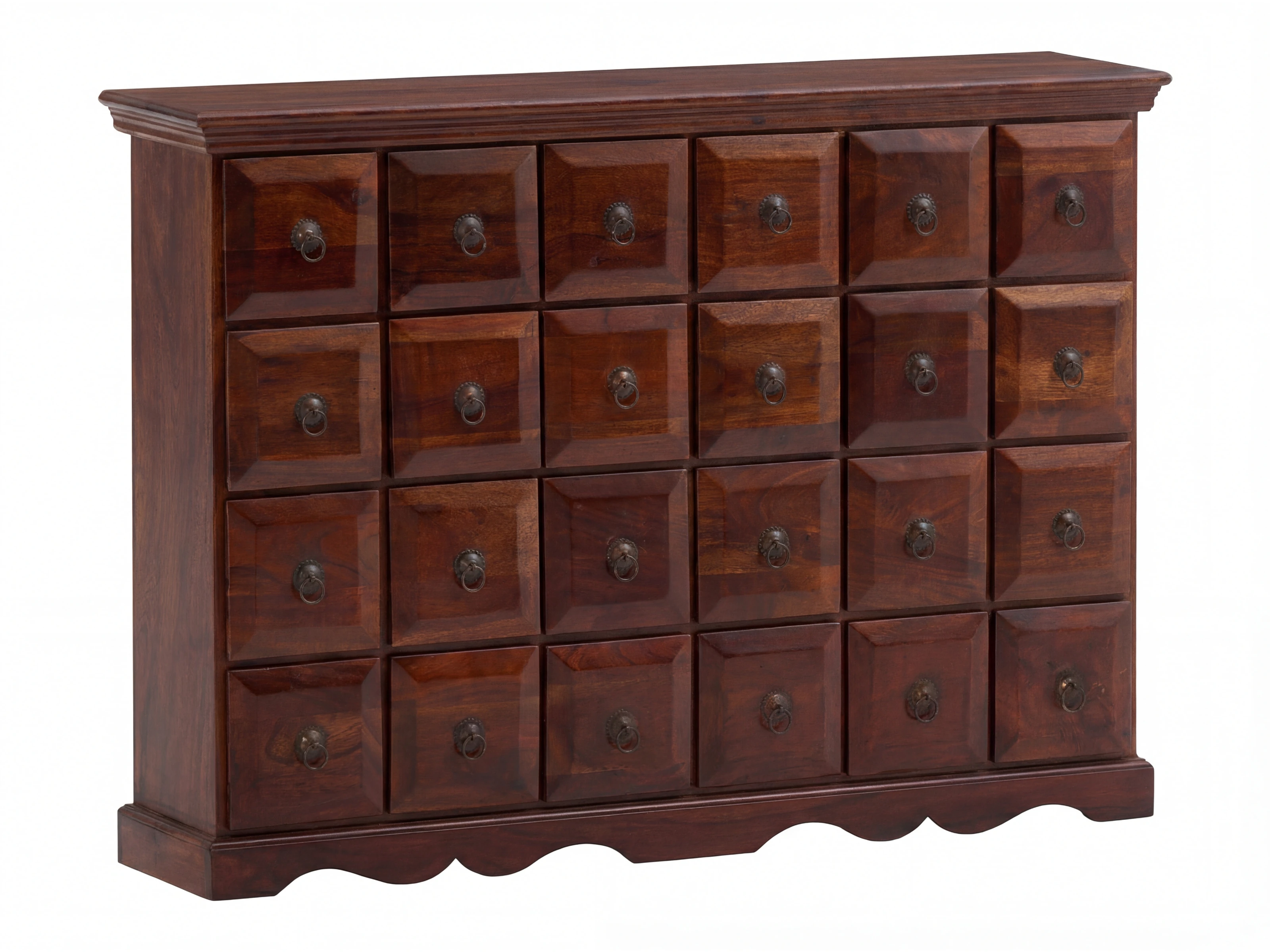 Niespotykana komoda apteczna z dwudziestoma czterema szufladkami, z serii Teksas. Pomieści wiele drobiazgów, dla których w domu trudno znaleźć odpowiednie miejsce. Ten mebel został wykonany z litego drewna akacji indyjskiej. Barwiony w kolorze ciemnobrązowym, wykończony lakierem matowym. Bardzo solidna, waga komody to 53 kg.