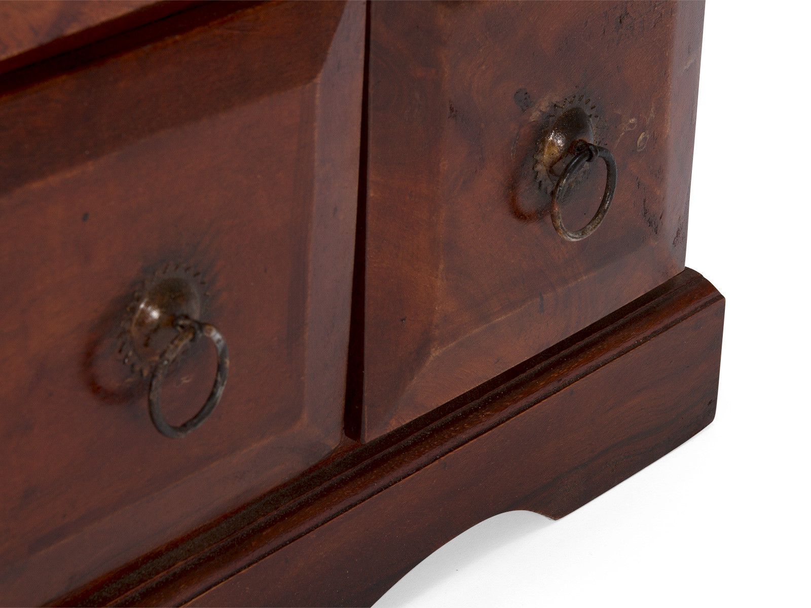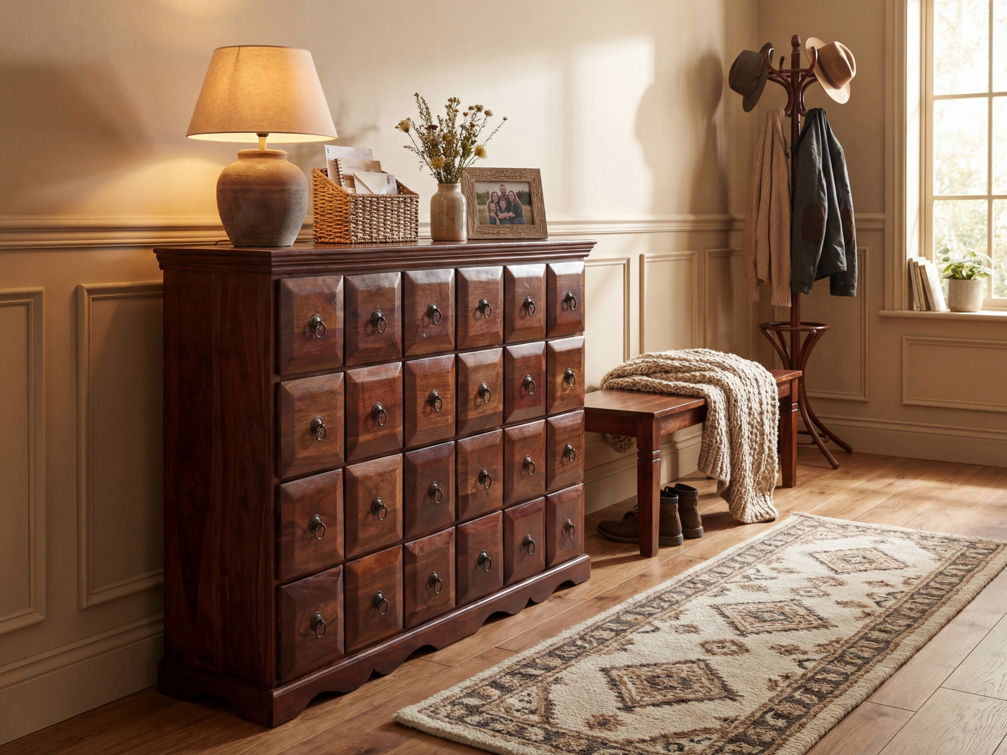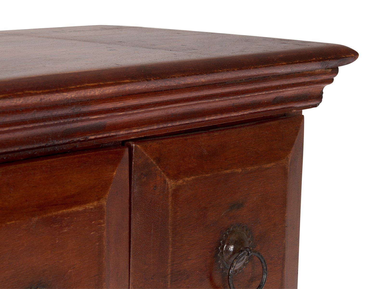 Niespotykana komoda apteczna z dwudziestoma czterema szufladkami, z serii Teksas. Pomieści wiele drobiazgów, dla których w domu trudno znaleźć odpowiednie miejsce. Ten mebel został wykonany z litego drewna akacji indyjskiej. Barwiony w kolorze ciemnobrązowym, wykończony lakierem matowym. Bardzo solidna, waga komody to 53 kg.