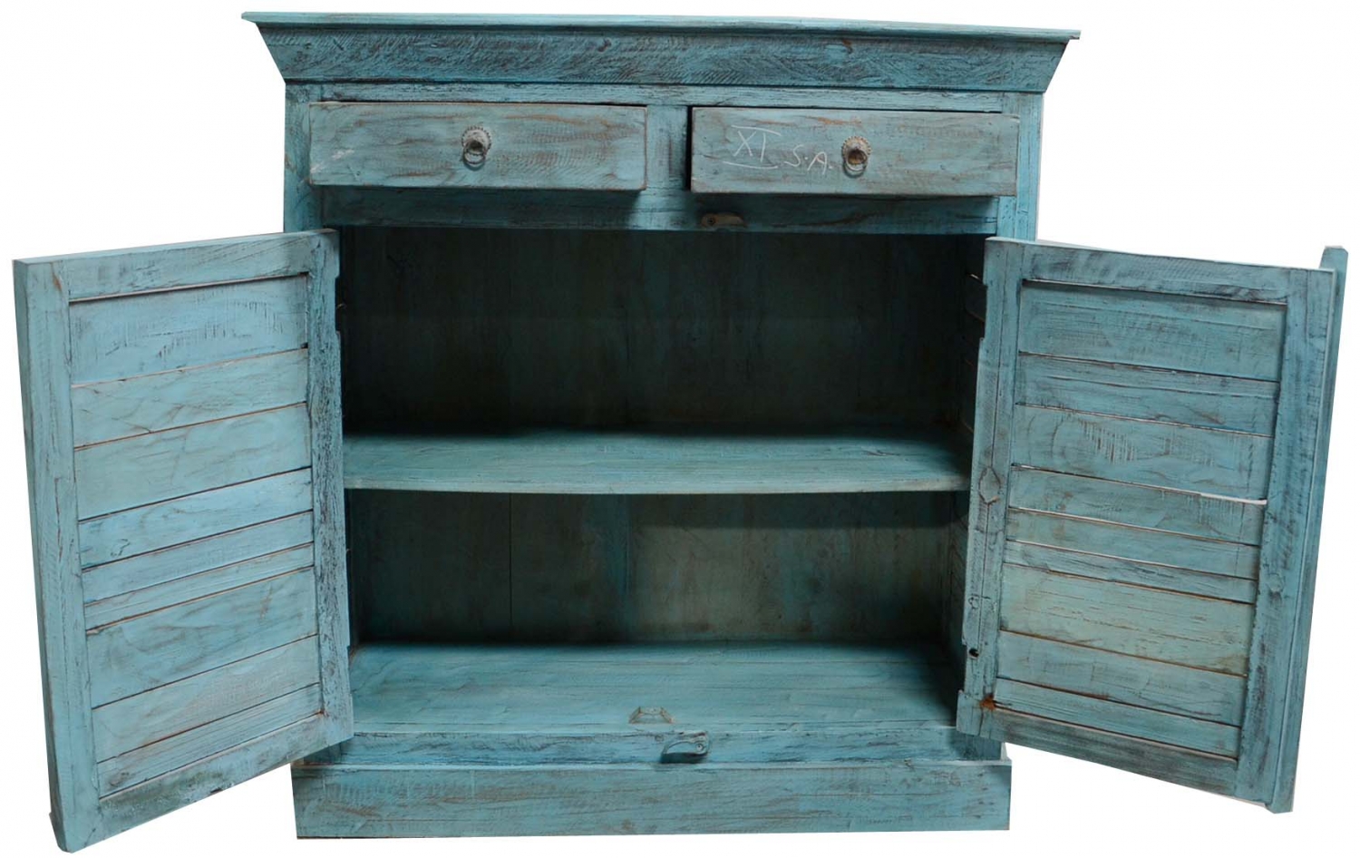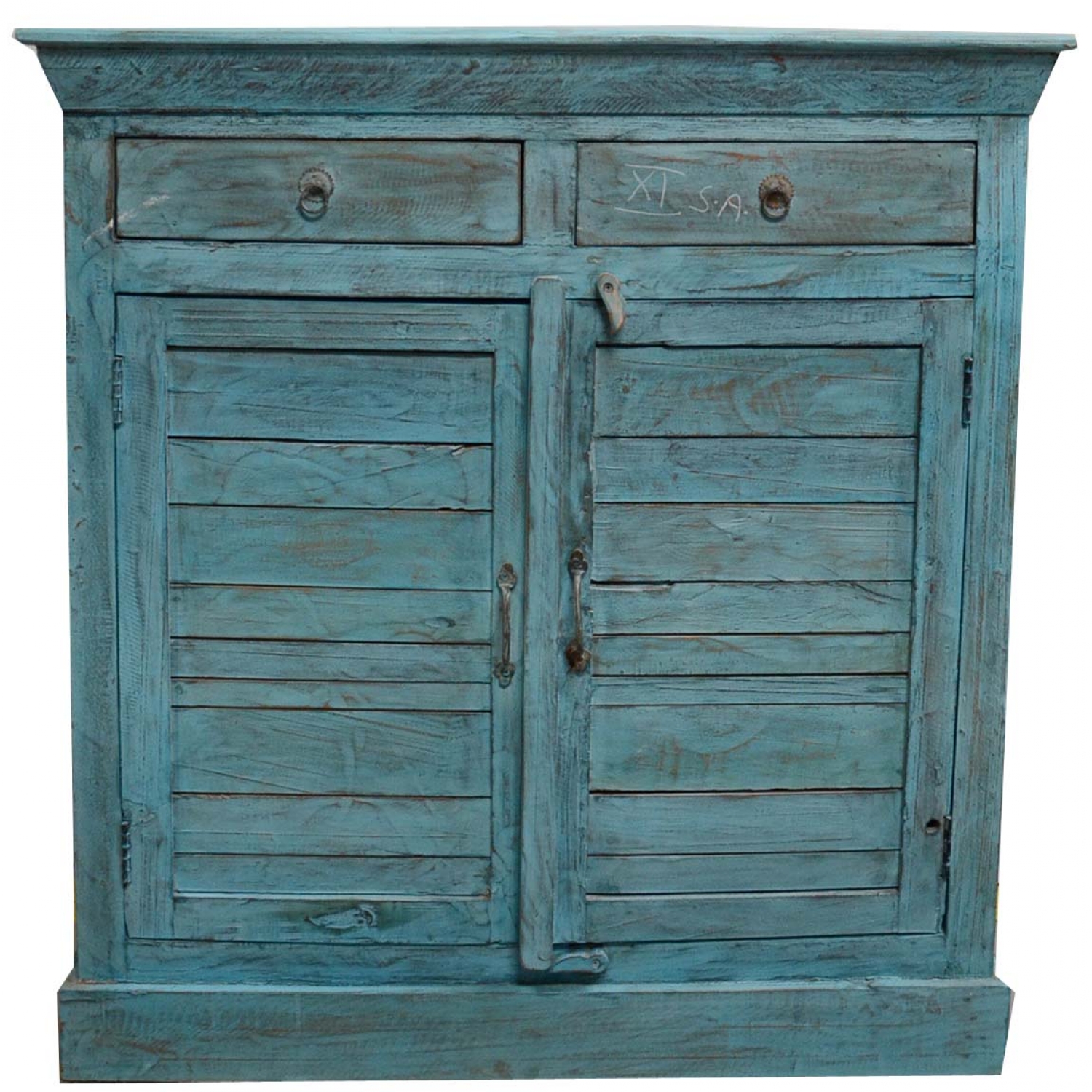 Kunsztownie odrestaurowana komoda z drewna egzotycznego( z recyklingu ) w kolorze turkusowym.