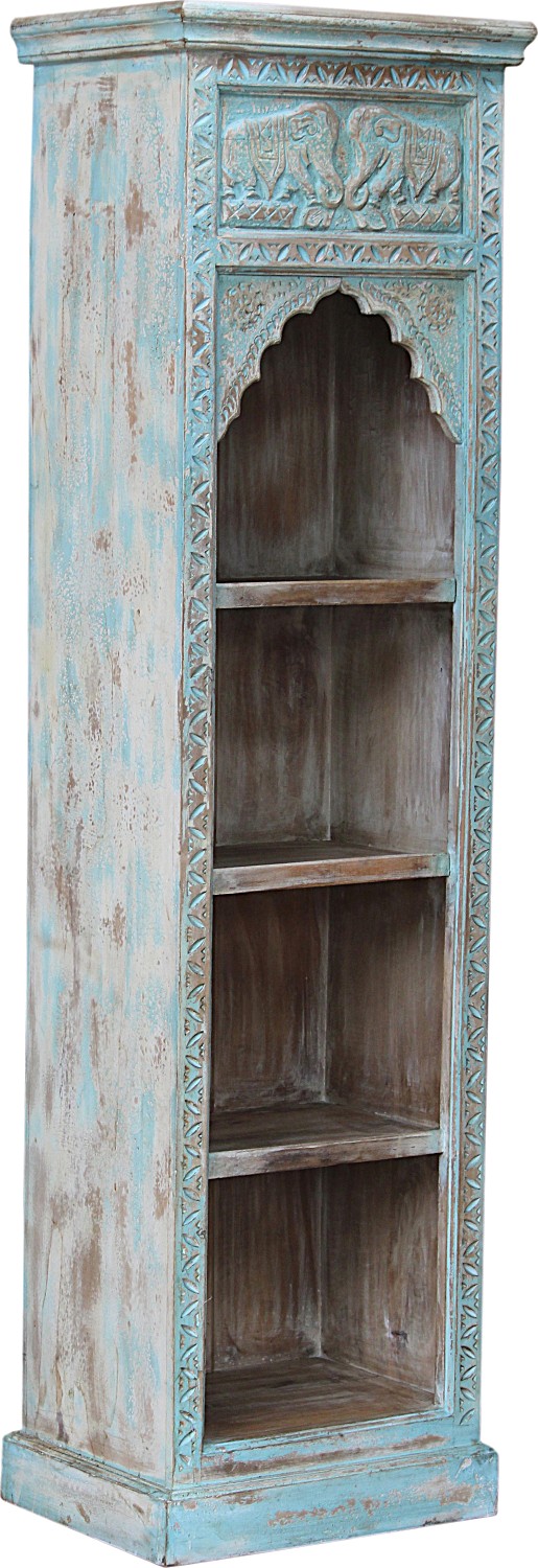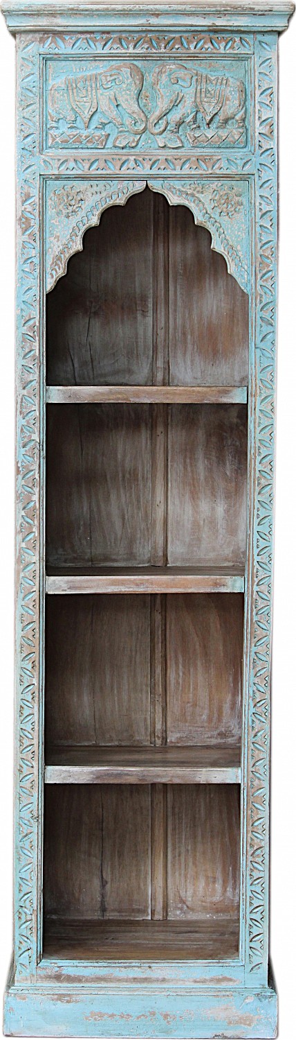 Indyjski antyczny regał z odzyskanego drewna egzotycznego(w większości antycznego- z dawnych indyjskich rezydencji). Mebel bogato rzeżbiony w kolorze turkusowym.