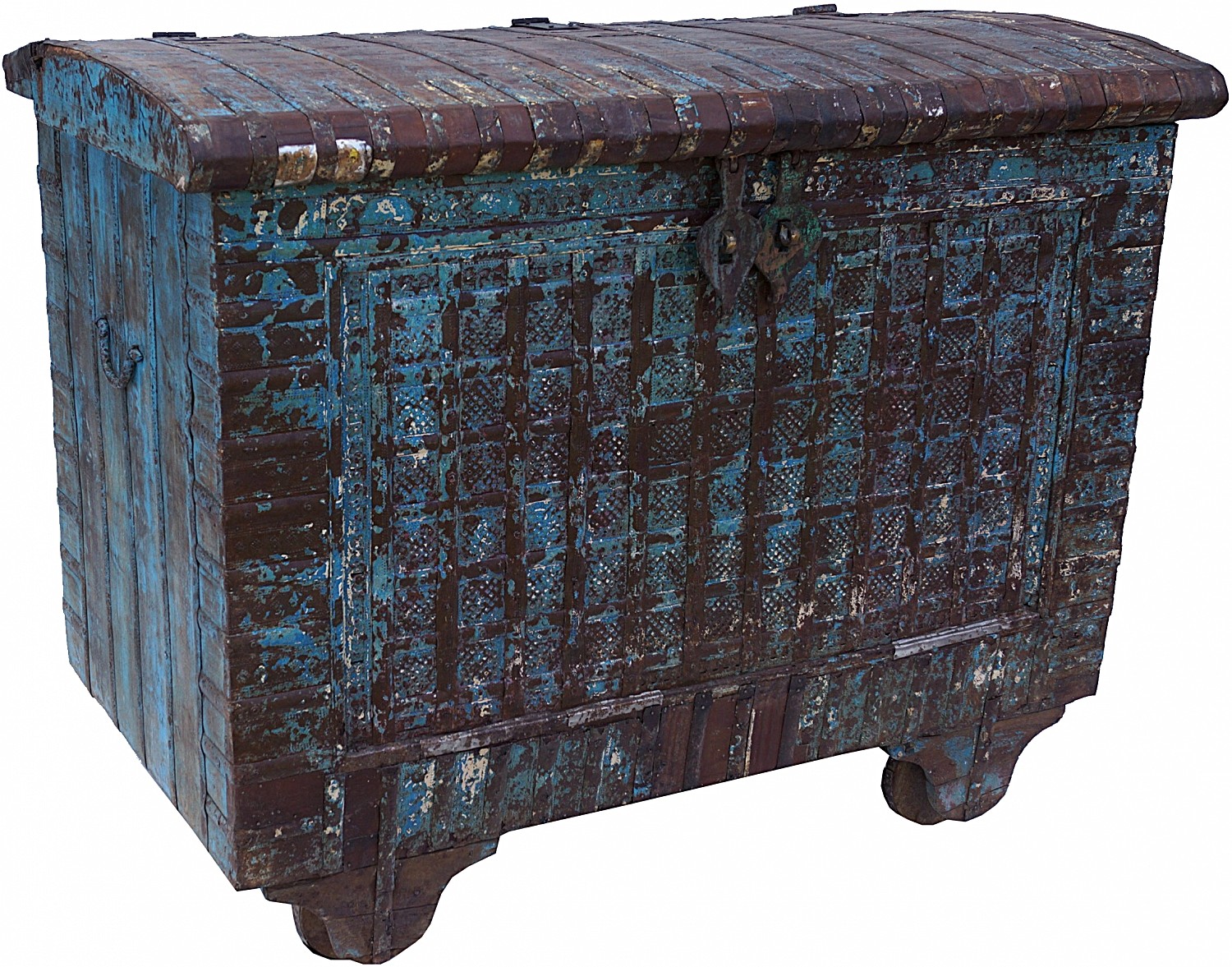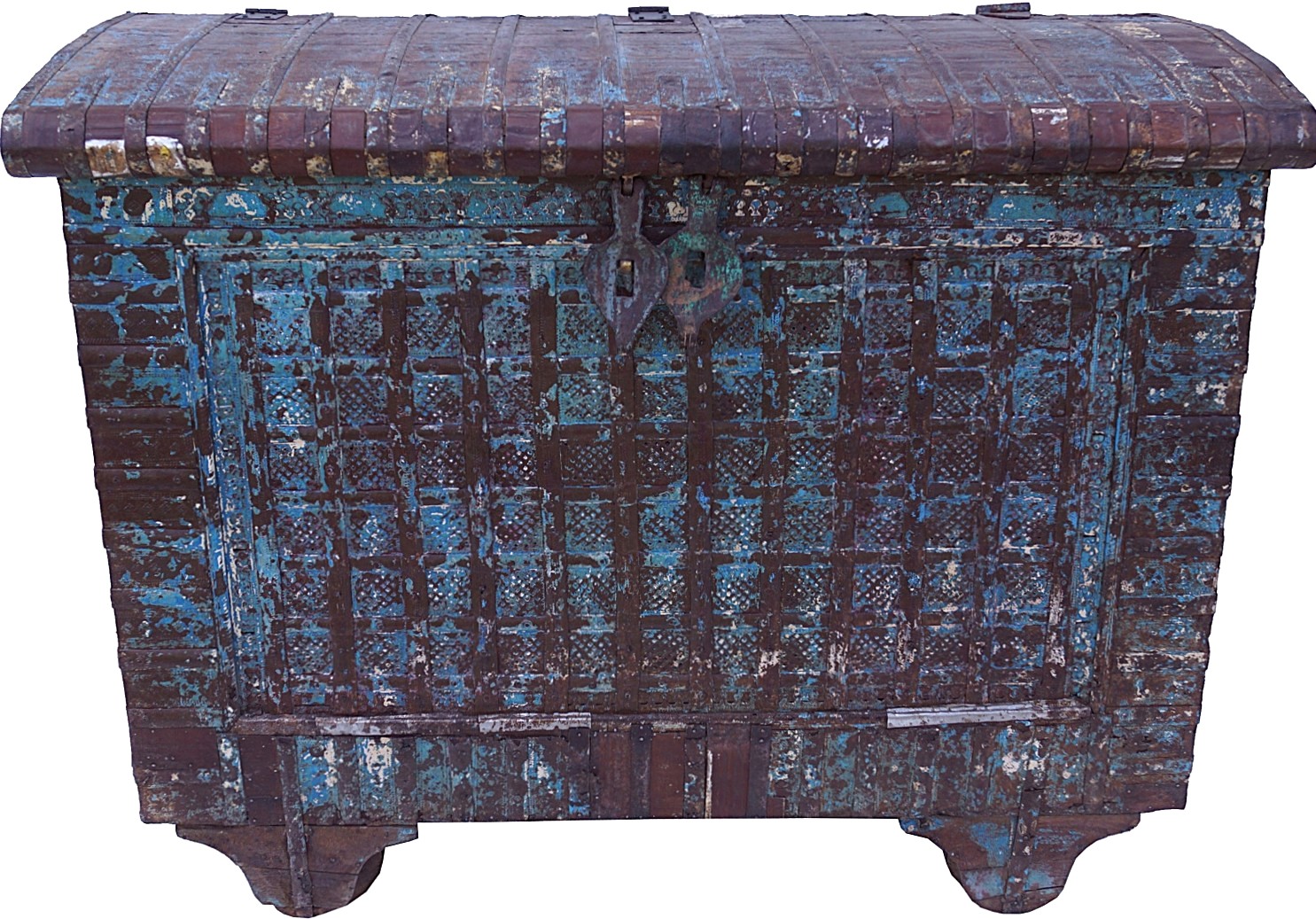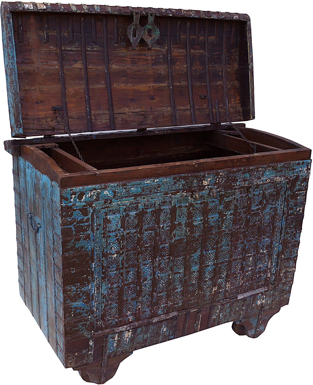 Przepiękna antyczna skrzynia z Indii. Charakteryzuje się misternymi, kutymi, żelaznymi okuciami. Ręczne wykonanie z drewna tekowego w kolorze niebiesko-brązowym