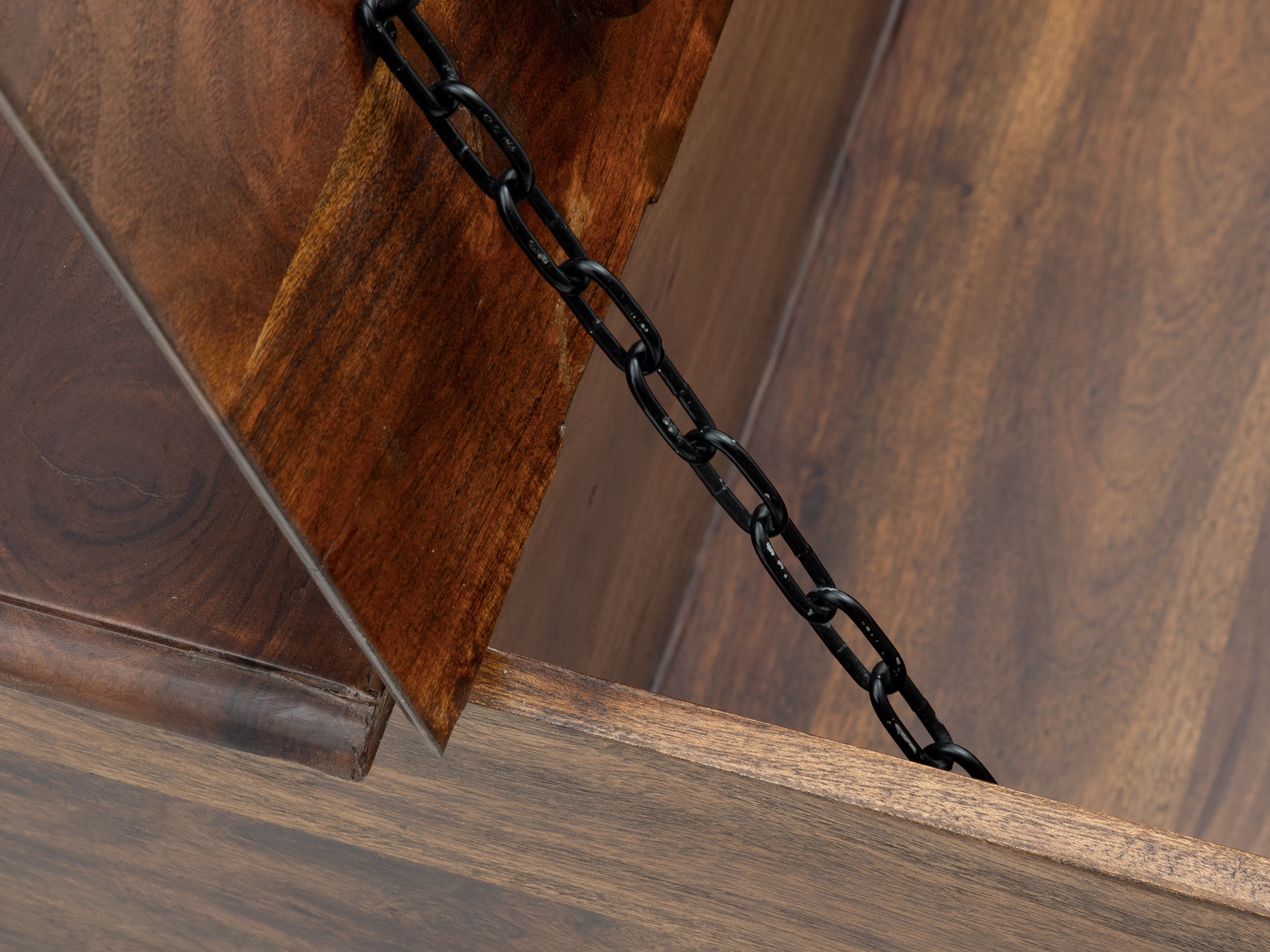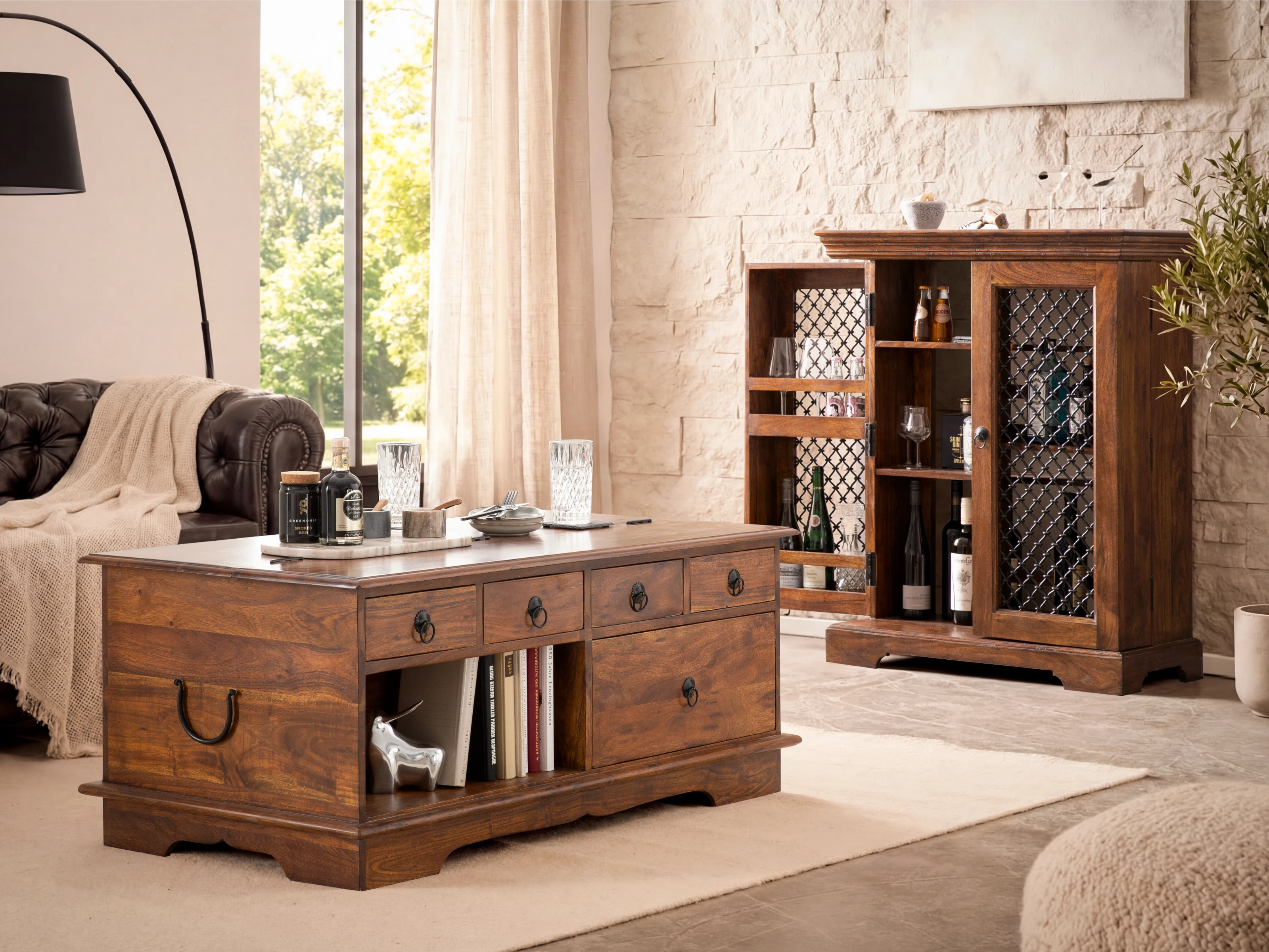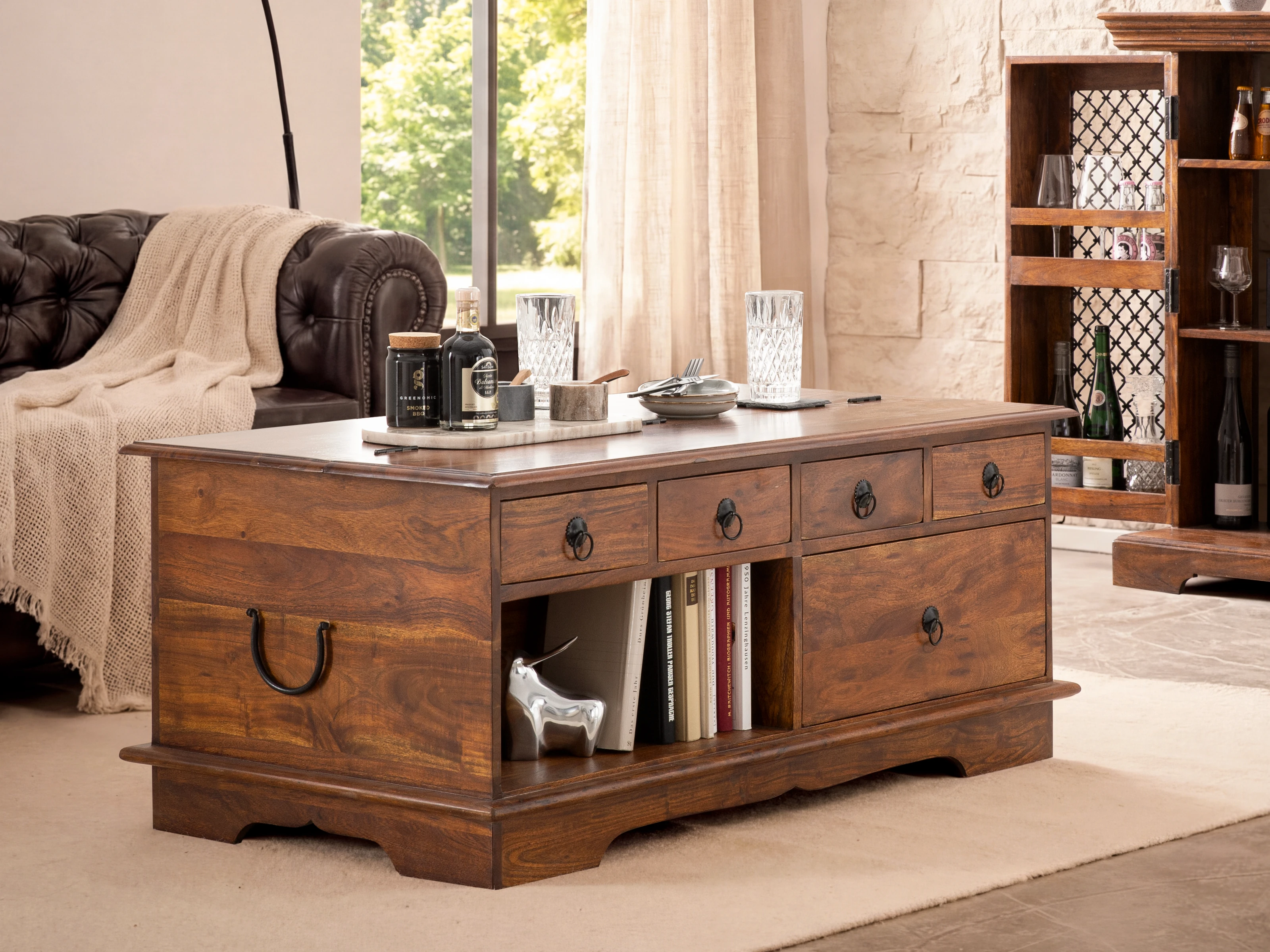 Stolik kawowy Merlow III łączy w sobie zalety kilku mebli jednocześnie. Oferuje wielofunkcyjną przestrzeń do przechowywania, z 12 szufladami z jednej strony oraz schowkiem-skrzynią w drugiej połowie. Wykonany jest z drewna akacji indyjskiej, w kolorze brązowym, z widocznym pięknym usłojeniem. Jest bardzo ciężki i stabilny.