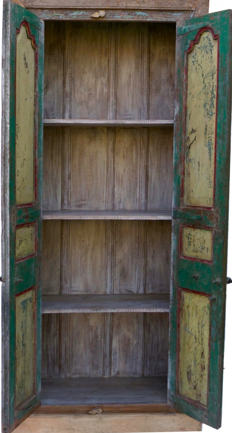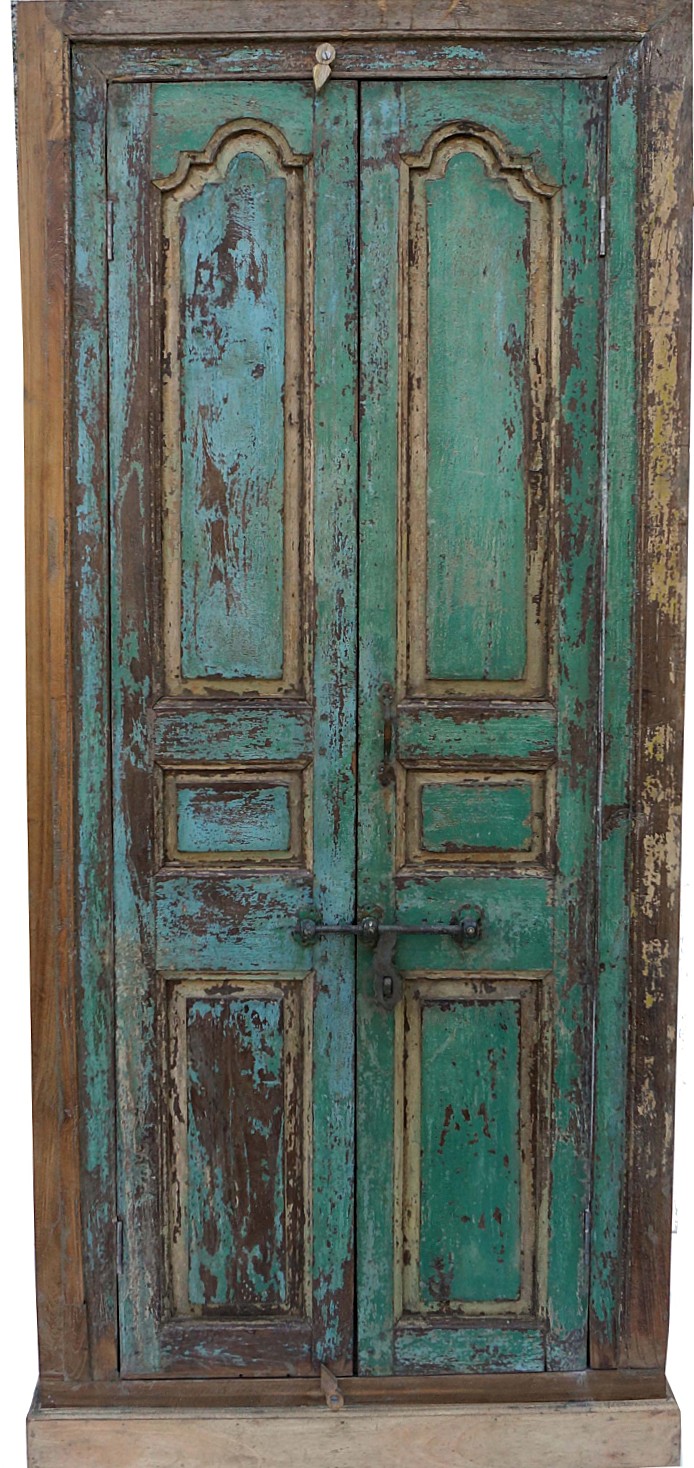 Przepiękna, kunsztownie odrestaurowana indyjska antyczna szafa, wykonana z egzotycznego drewna z recyklingu. Front szafy w kolorze zielono-niebieskim, w stylistyce śródziemnomorskiej. Waga ok. 75kg.