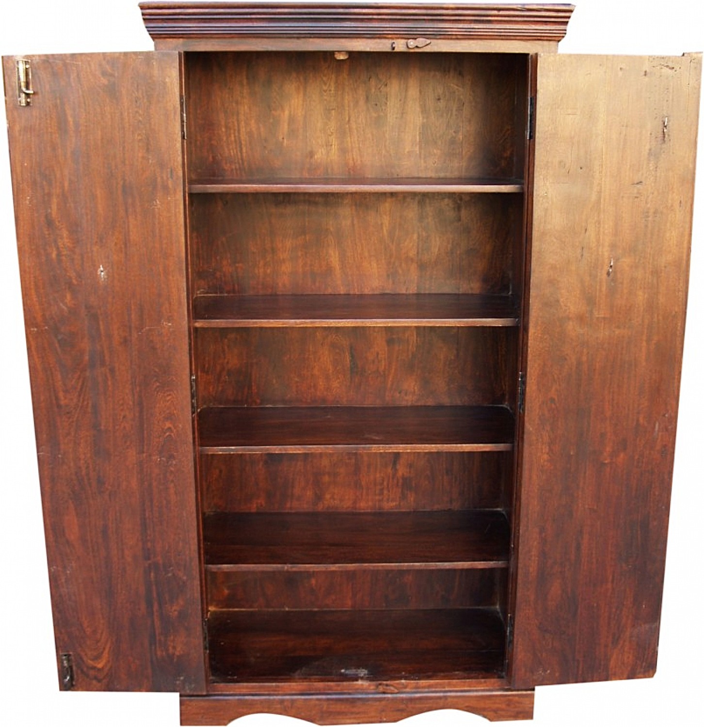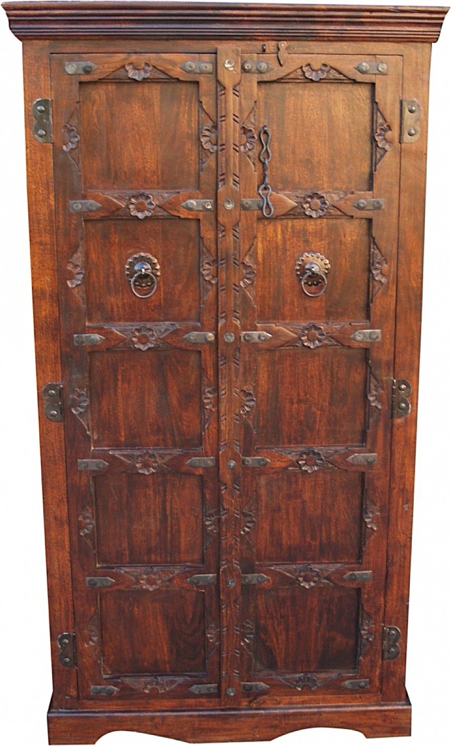 Ręcznie wykonana, misternie rzeżbiona szafa z drewna akacji indyjskiej w kolorze brązowym. Wykonana w stanie Radżastan przez tamtejszych wysoko wykwalifikowanych rzemieślników. Dodatkowo zdobiona metalowymi okuciami oraz dekoracyjnym łańcuchem.