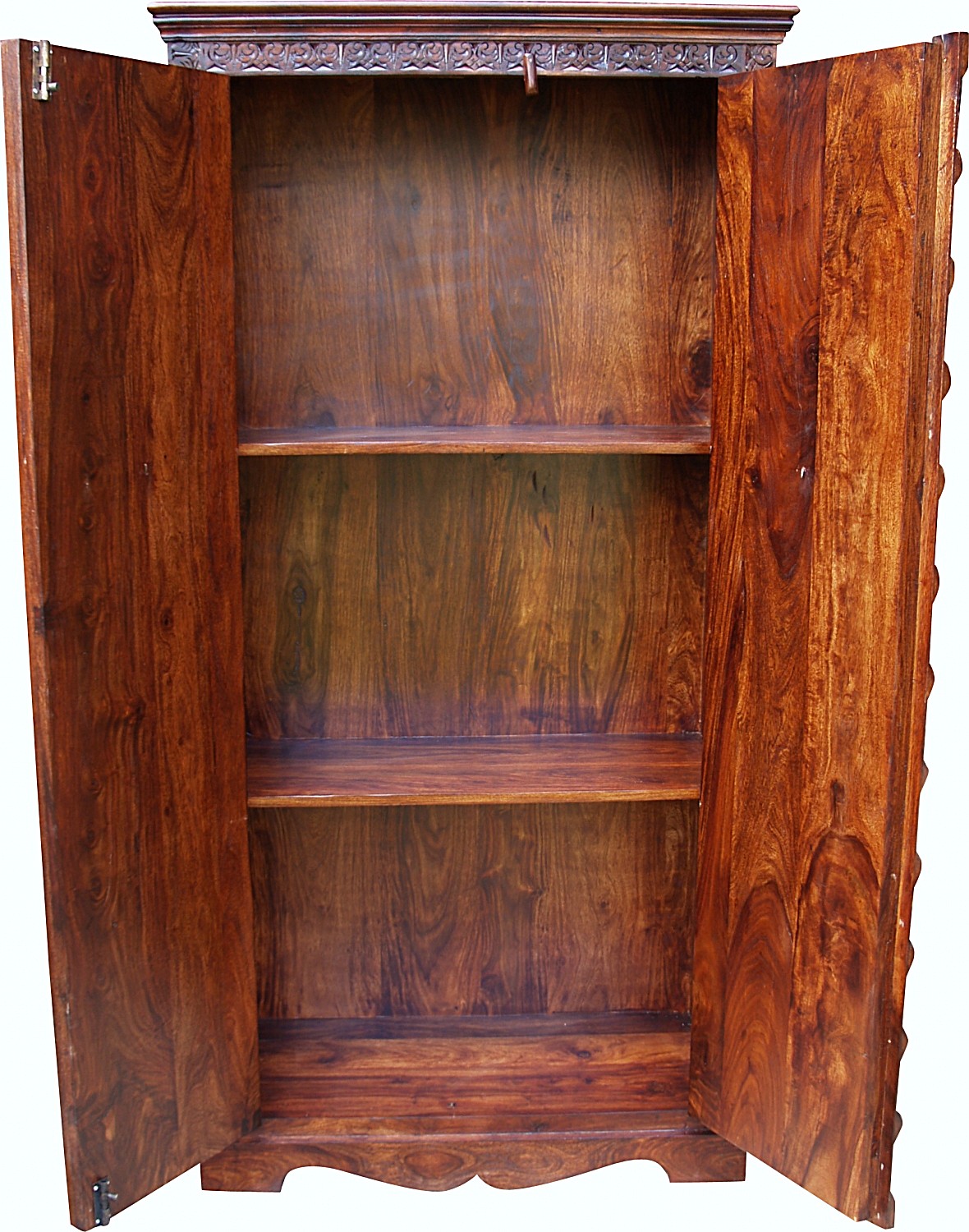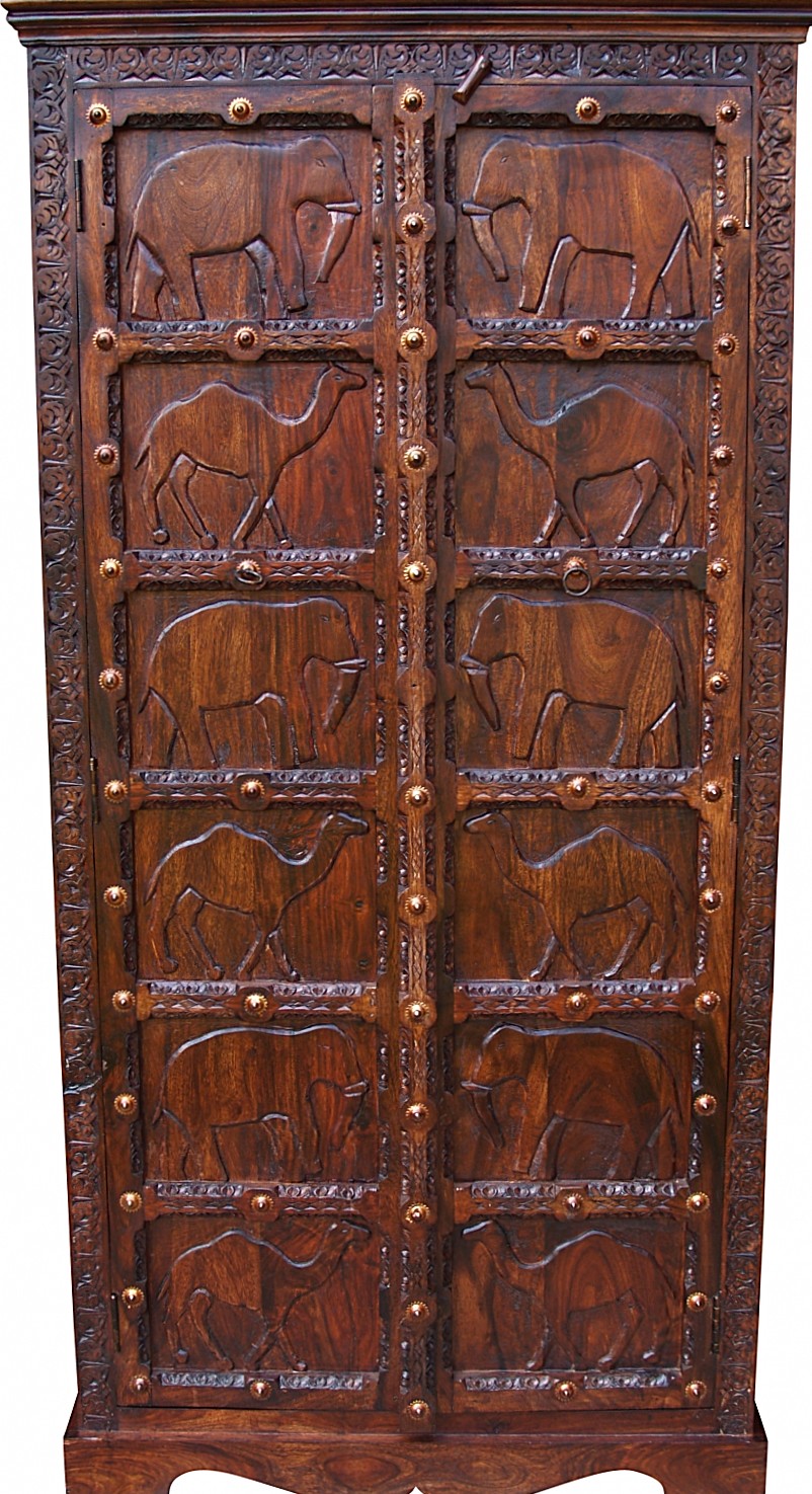 Ręcznie wykonana, misternie rzeżbiona szafa z drewna akacji indyjskiej w kolorze brązowym. Wykonana w stanie Radżastan przez tamtejszych wysoko wykwalifikowanych rzemieślników. Dodatkowo zdobiona metalowymi okuciami.