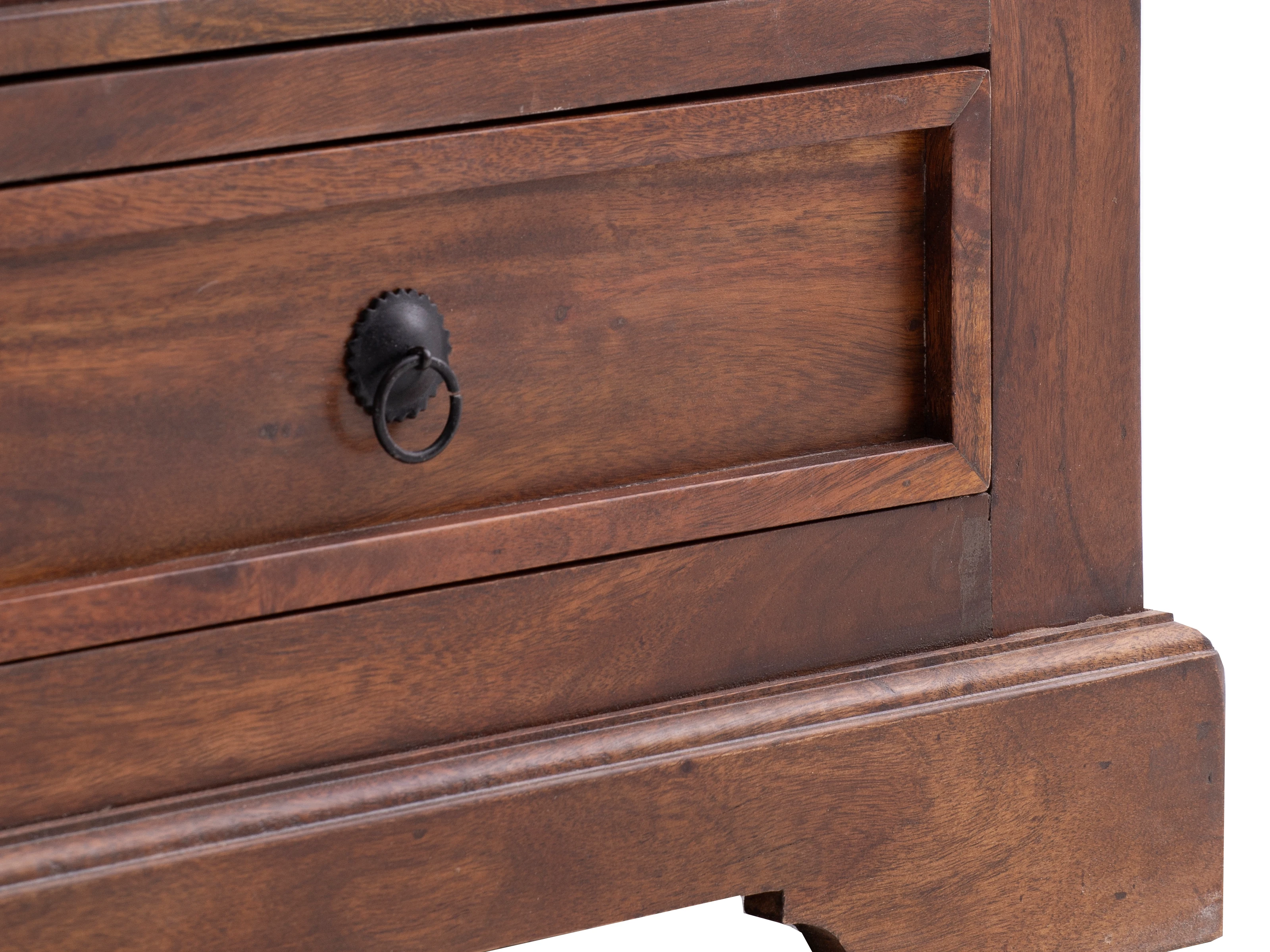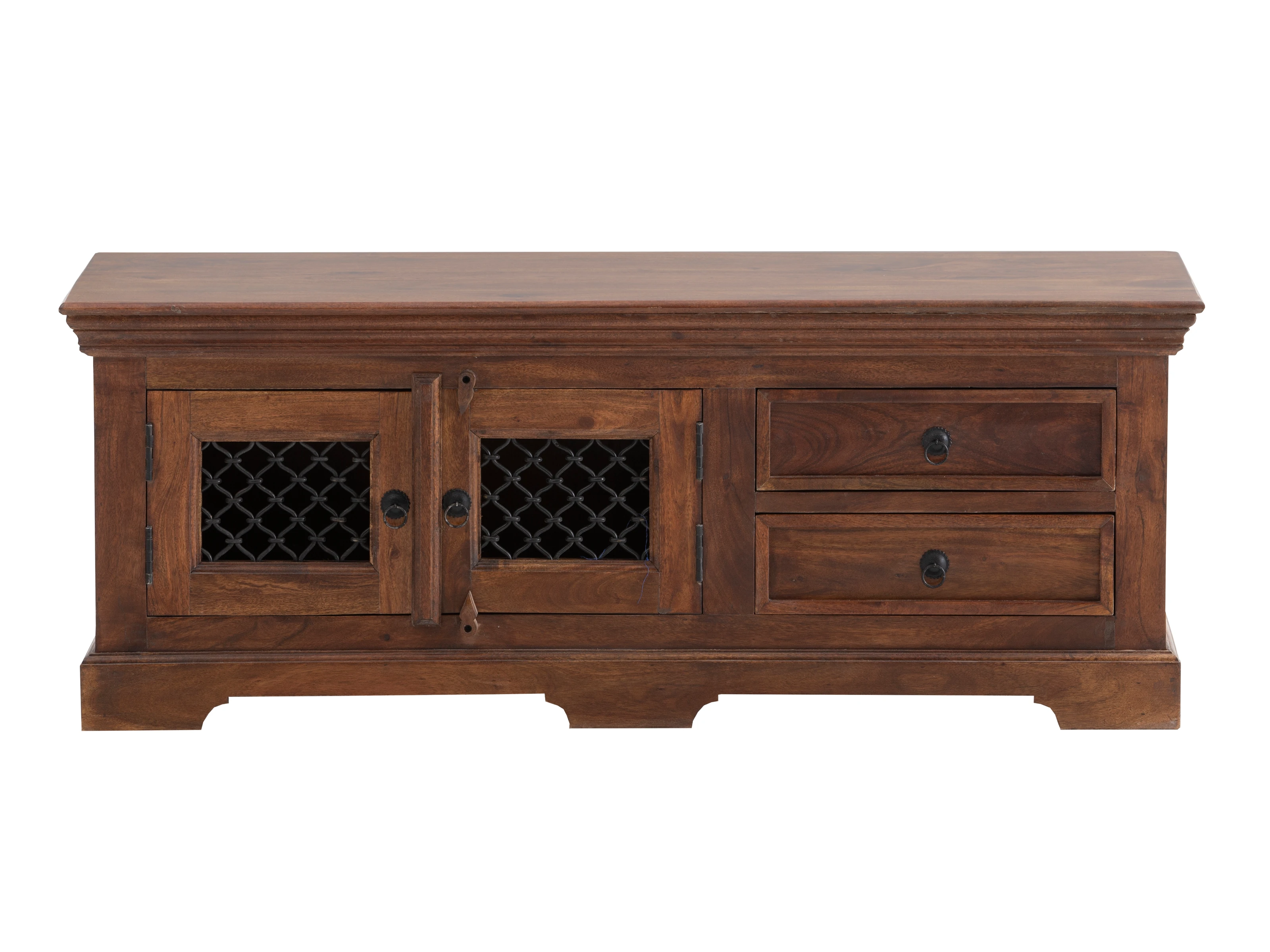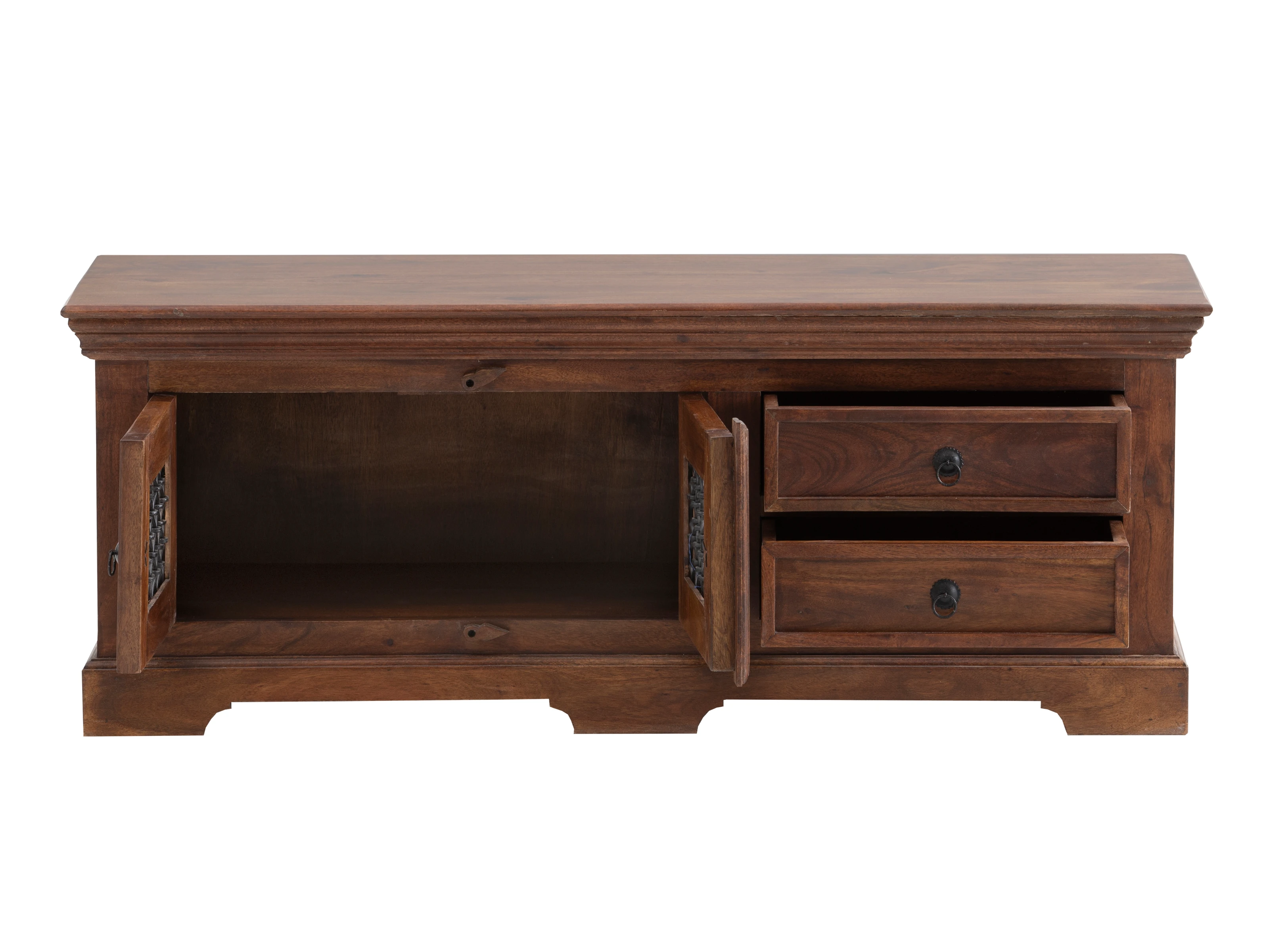 Szafka pod telewizor z serii Merlow została wykonana ręcznie w Indiach z drewna akacji. Kute detale w drzwiczkach oraz kolorystyka mebla nawiązuje do klasycznego stylu kolonialnego. Dwie szuflady oraz przestrzeń zamykana drzwiczkami z metalową kratką, zapewniają praktyczne miejsce do składowania kabli, pilotów oraz różnego rodzaju drobnych akcesoriów.