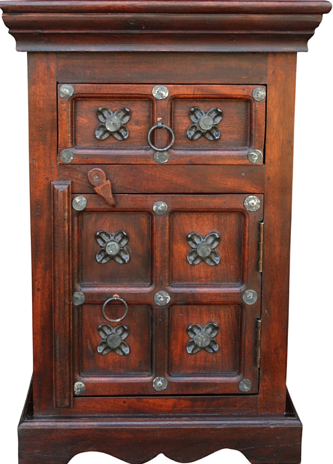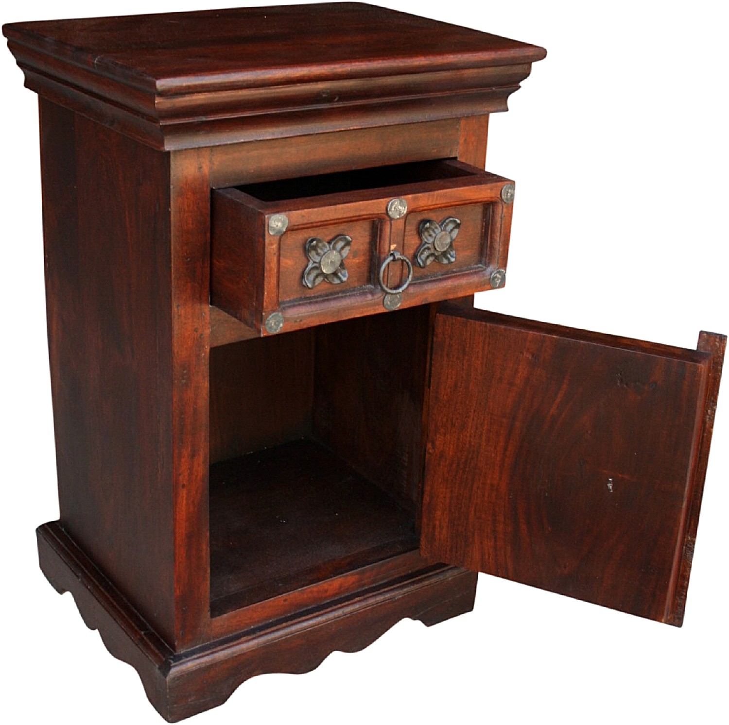 Szafka nocna wykonana w całości z drewna palisandru, zdobiona żelaznymi okuciami w kolorze brązowym.