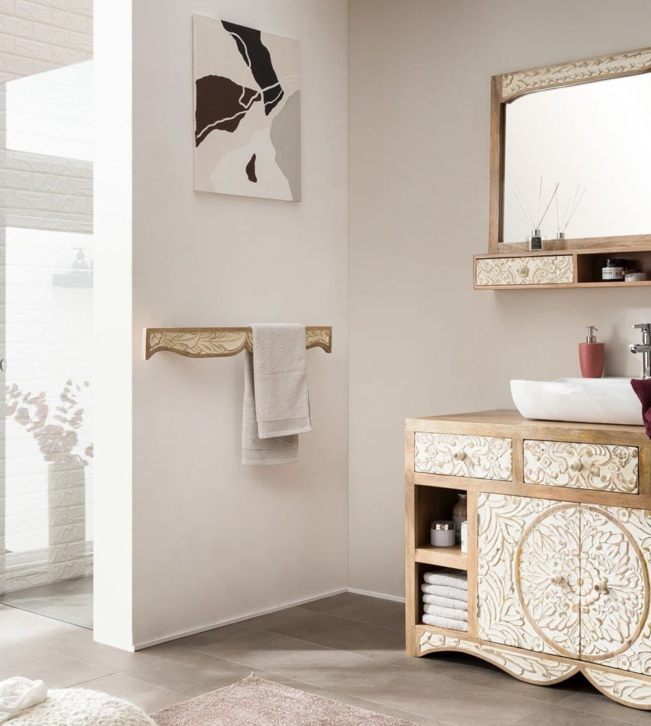 Wieszak na ręczniki z serii Delhi wykonany został w Indiach z drewna mango. Fronty są misternie rzeźbione ręcznie i nadają tej serii dyskretnie egzotyczny charakter. Powierzchnie zostały pomalowane matowym lakierem dla zabezpieczenia przed wilgocią i zabrudzeniami. Wieszak pasuje doskonale do mebli łazienkowych Delhi, widocznych na zdjęciu sesyjnym.