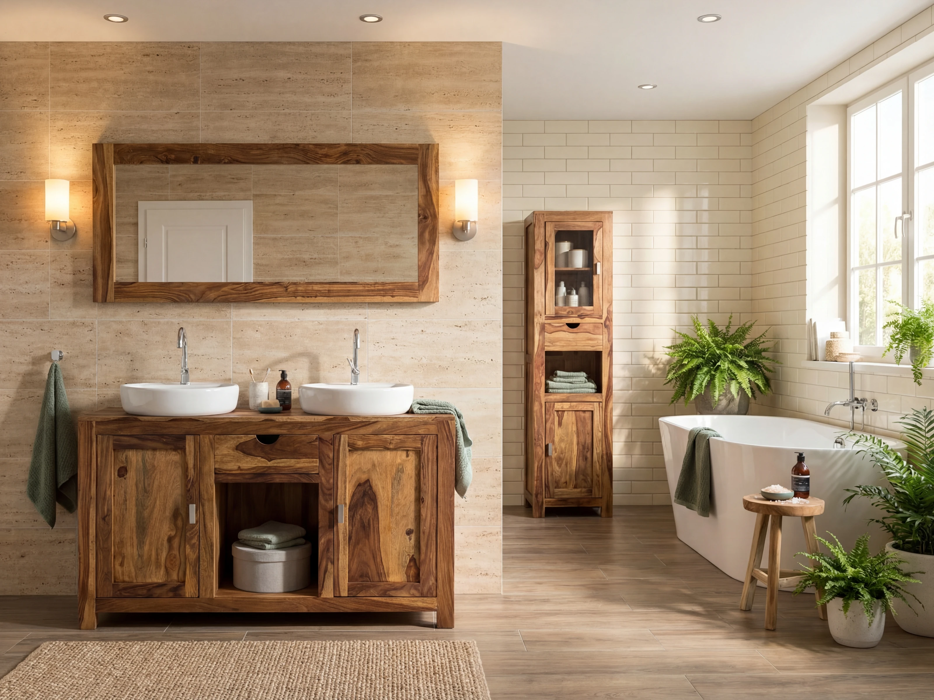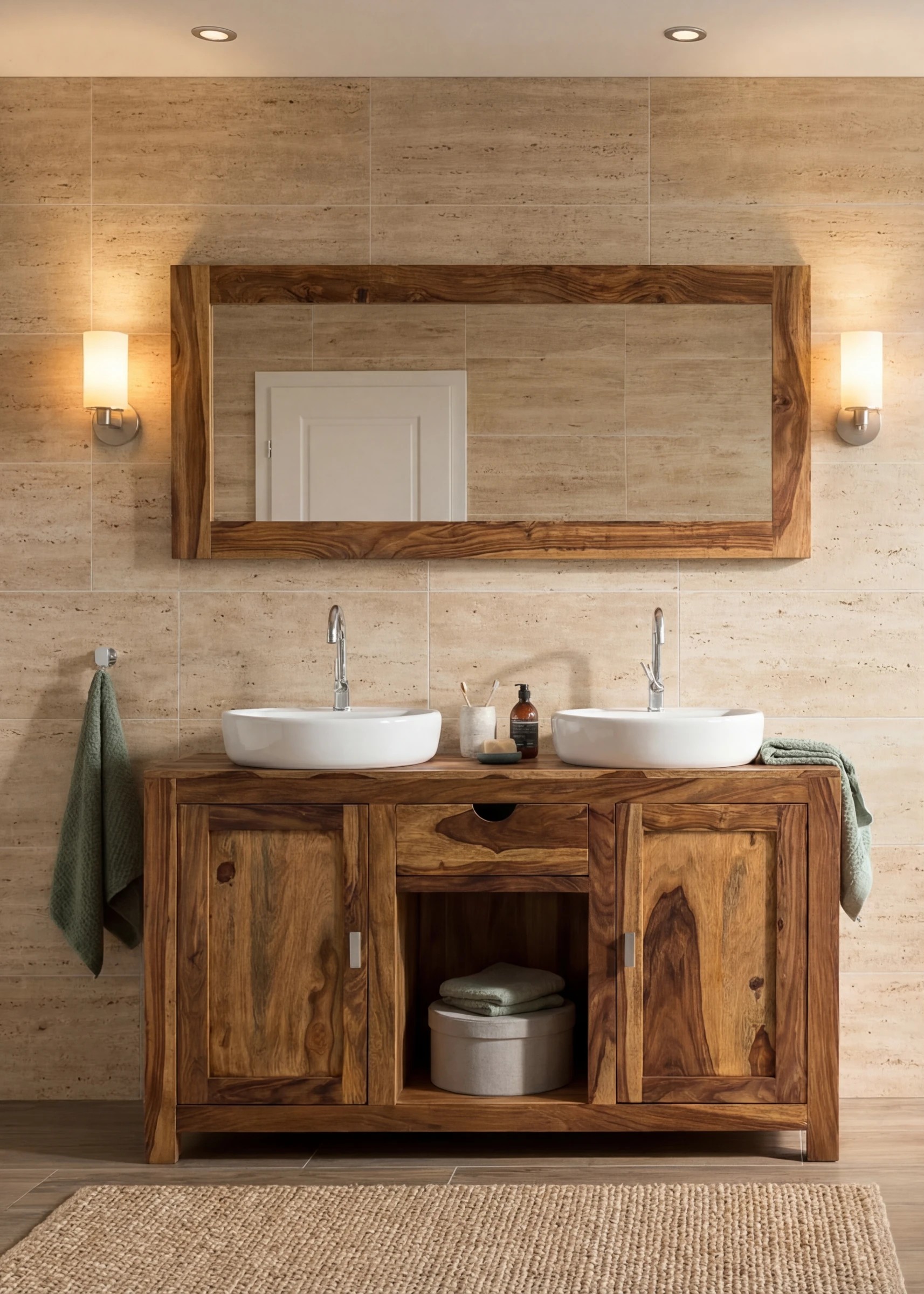 Zestaw mebli łazienkowych Leros został wykonany w Indiach z pełnego drewna akacji. Zestaw składa się z dużej szafki pod dwie umywalki oraz pasującego lustra ściennego. Szafka o szerokości 130 cm oferuje dużo miejsca – jest idealna, gdy z łazienki korzysta kilka osób w tym samym czasie. Szeroka szafka jest przez to świetnym wyborem do większych łazienek i dla rodzin.